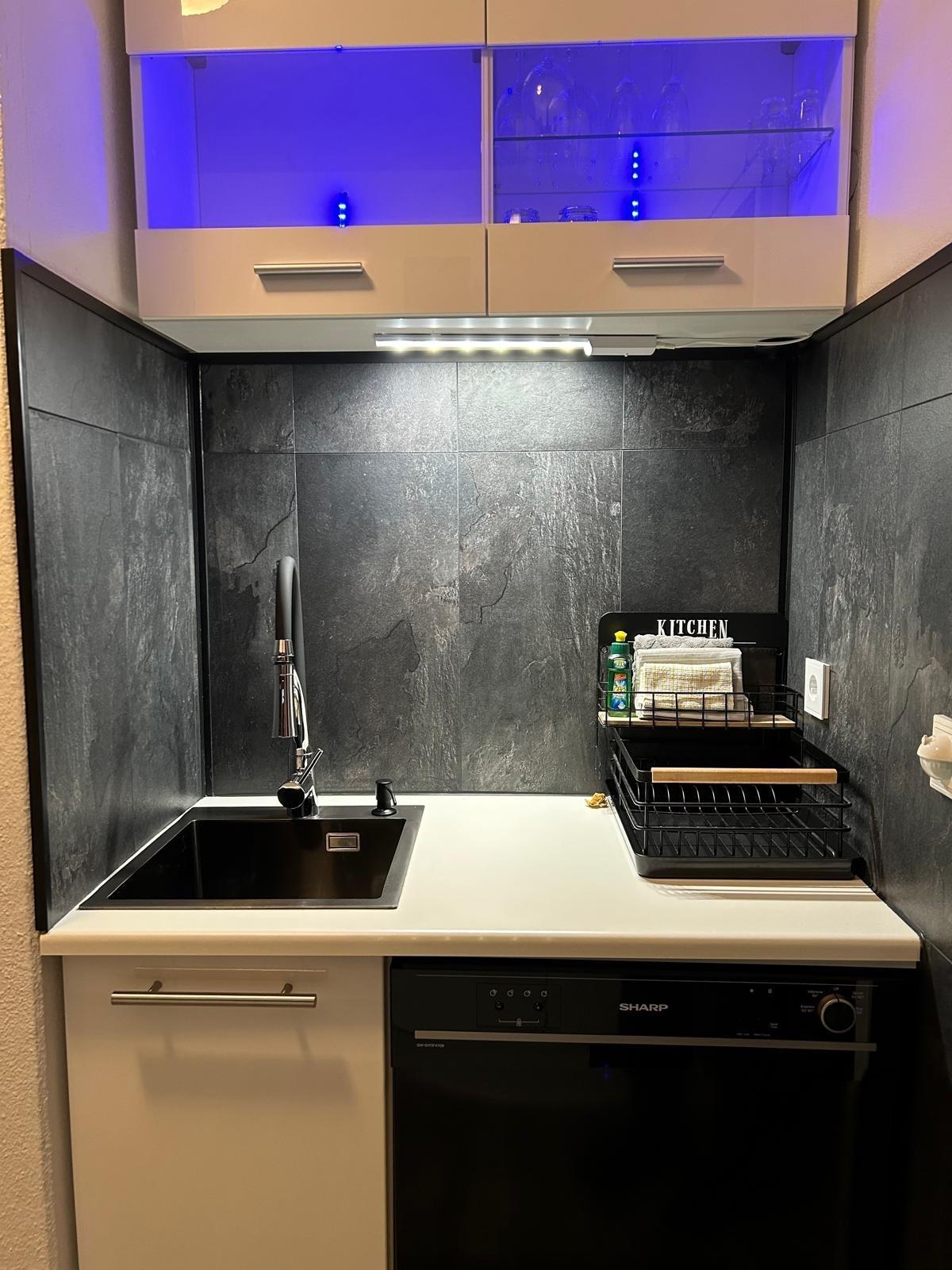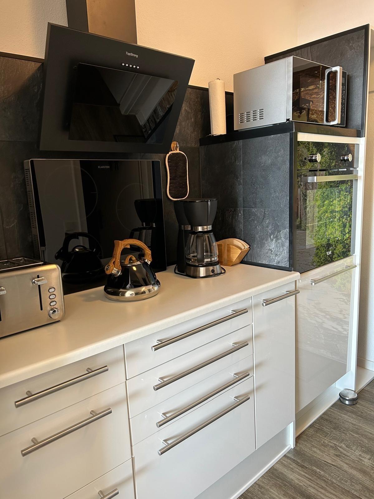 Die moderne, gut ausgestattete Küchenzeile bietet alles, was Sie für eine kleine Mahlzeit benötigen: Kaffeemaschine, Wasserkocher, Toaster, Eierkocher, Mikrowelle, Backofen, Induktionskochfeld, Kühlschrank und Geschirrspüler – alles da!