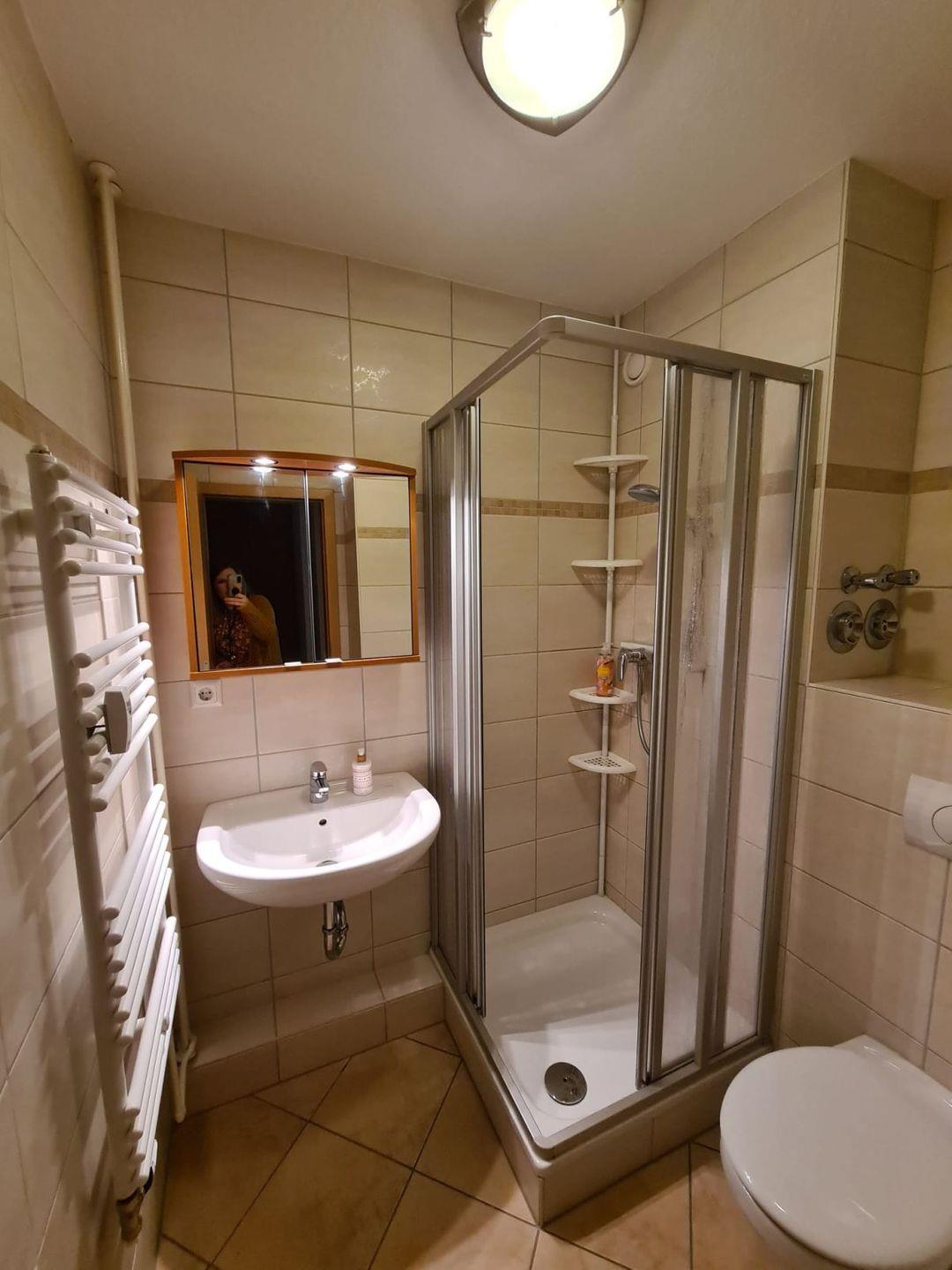 Das komfortable Badezimmer ist mit einer Duschkabine, WC und einem Spiegelschrank ausgestattet.
