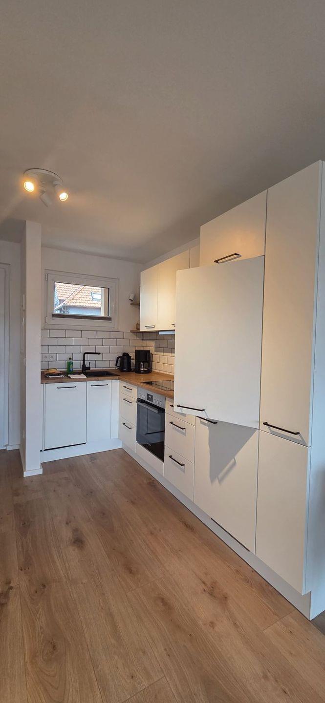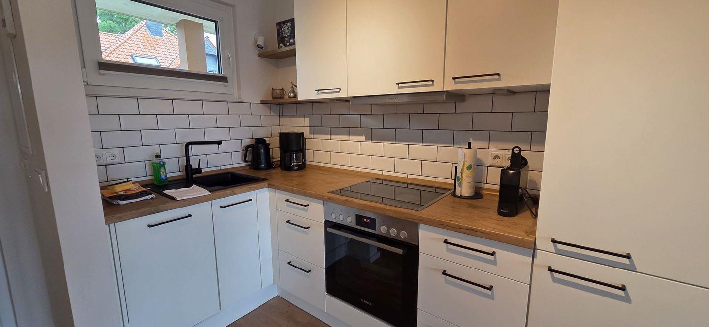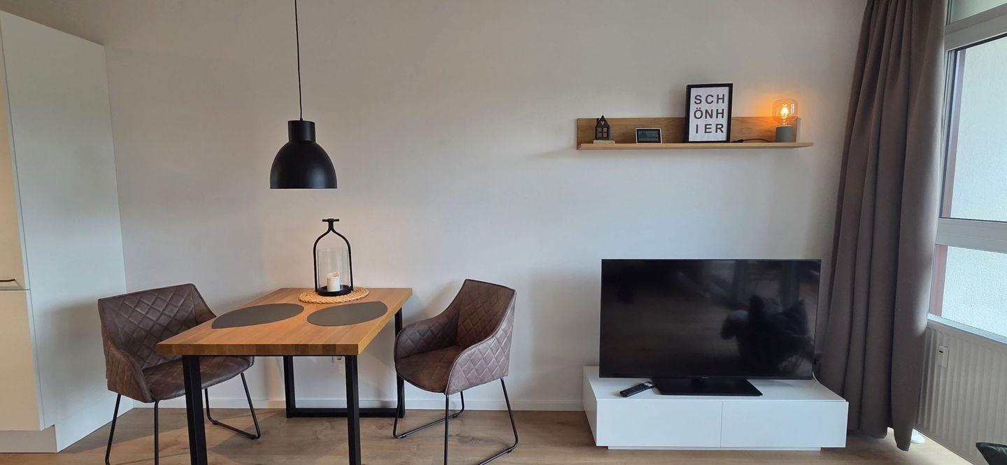 Die Wohnung ist modern ausgestattet und bietet eine offene Küche, in der Sie sich selbst versorgen können. Die hochwertige Küchenausstattung umfasst einen Herd, Kühlschrank mit Gefrierfach, Backofen, Geschirrspüler, Kaffeemaschine, Toaster und alle notwendigen Küchenutensilien. Handtücher sowie Bettwäsche sind bei Ihrem Aufenthalt bereits enthalten, sodass Sie sich um nichts kümmern müssen.