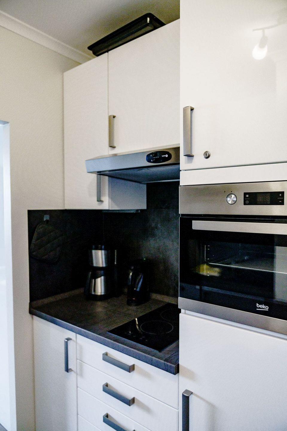 Die sehr gut ausgestattete Küchenzeile mit Mikrowelle, 2-Platten-Ceran-Herd, Spülmaschine, Kühlschrank mit Gefrierfach, Kaffeemaschine, Wasserkocher und vielem mehr bietet alles für gemeinsame Mahlzeiten.