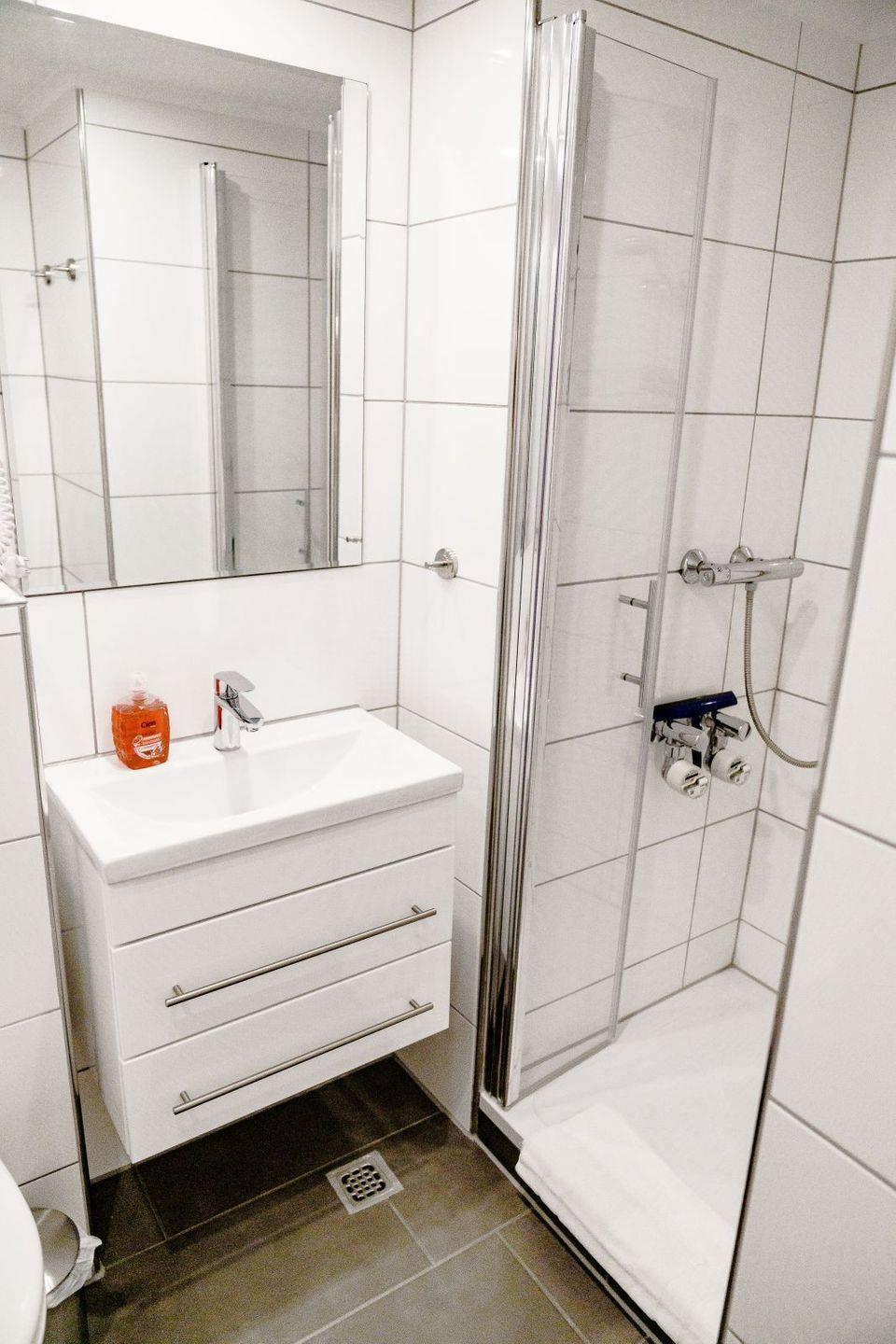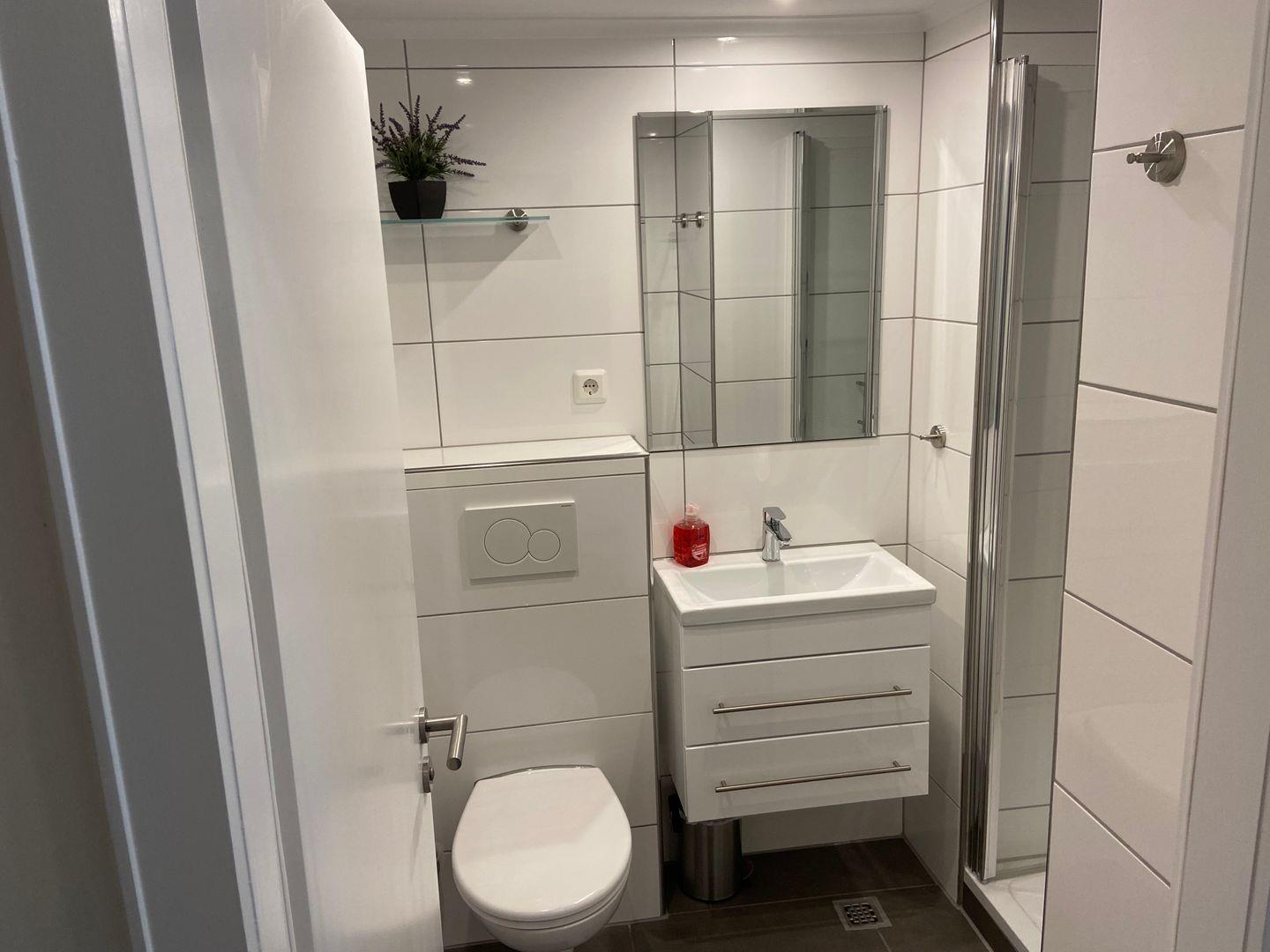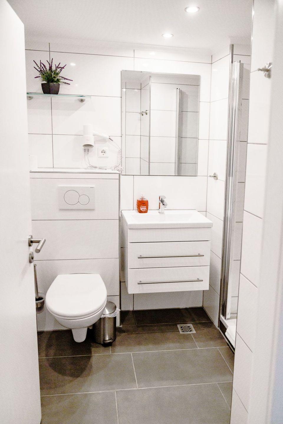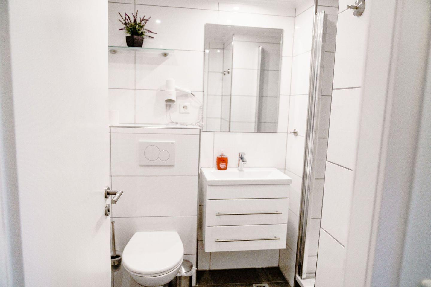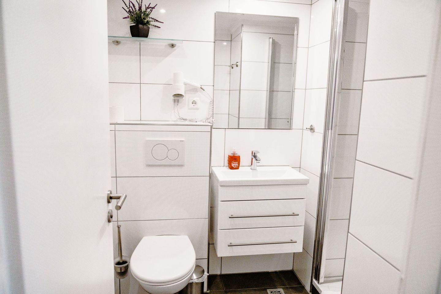 -Bad mit DU/WC, Fön, Kosmetikspiegel und Hygieneartikel