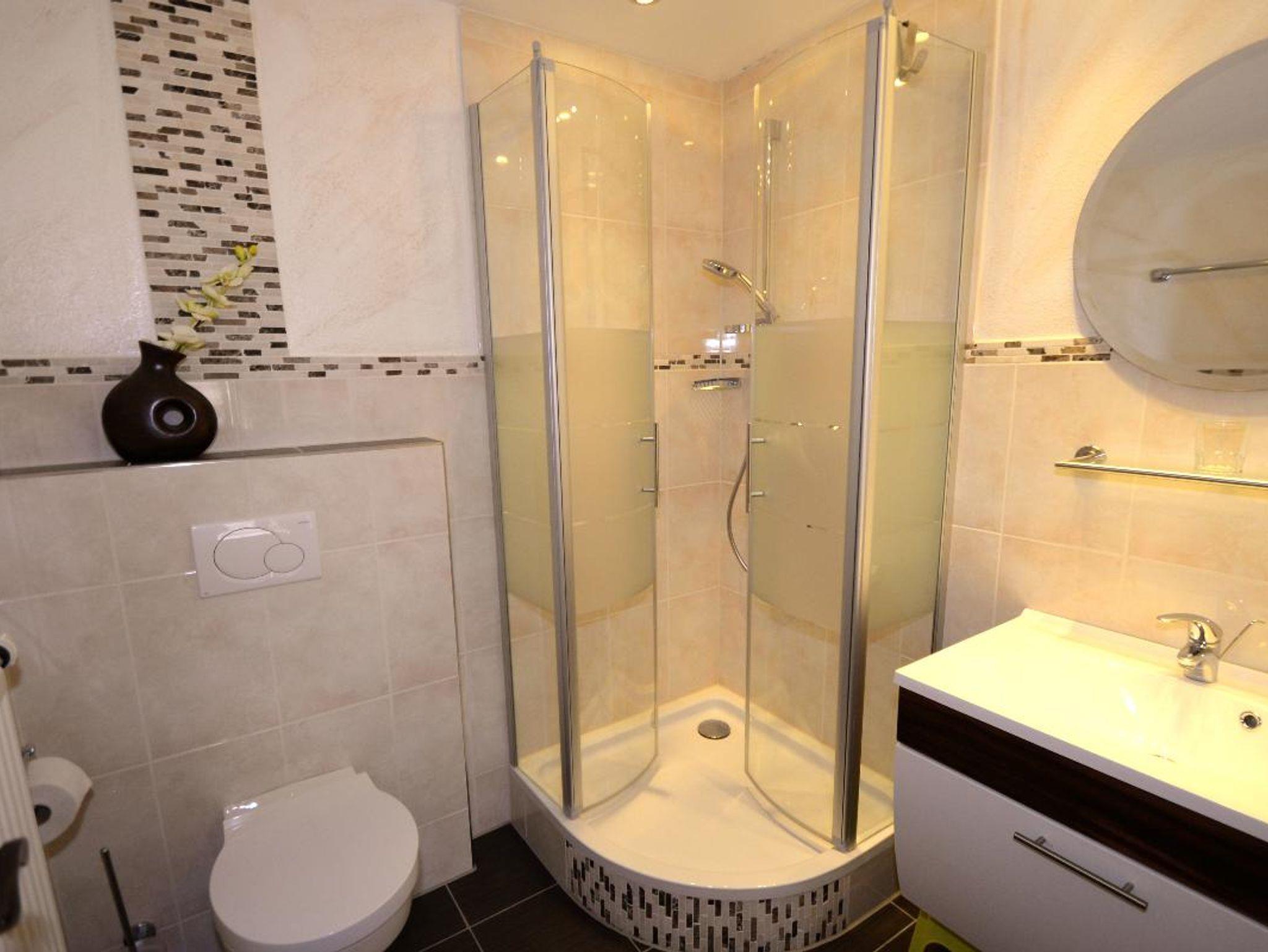 Das Badezimmer verfügt über eine Dusche sowie ein WC. Ein besonderer Pluspunkt ist der Balkon, der zum Verweilen und Entspannen einlädt.
