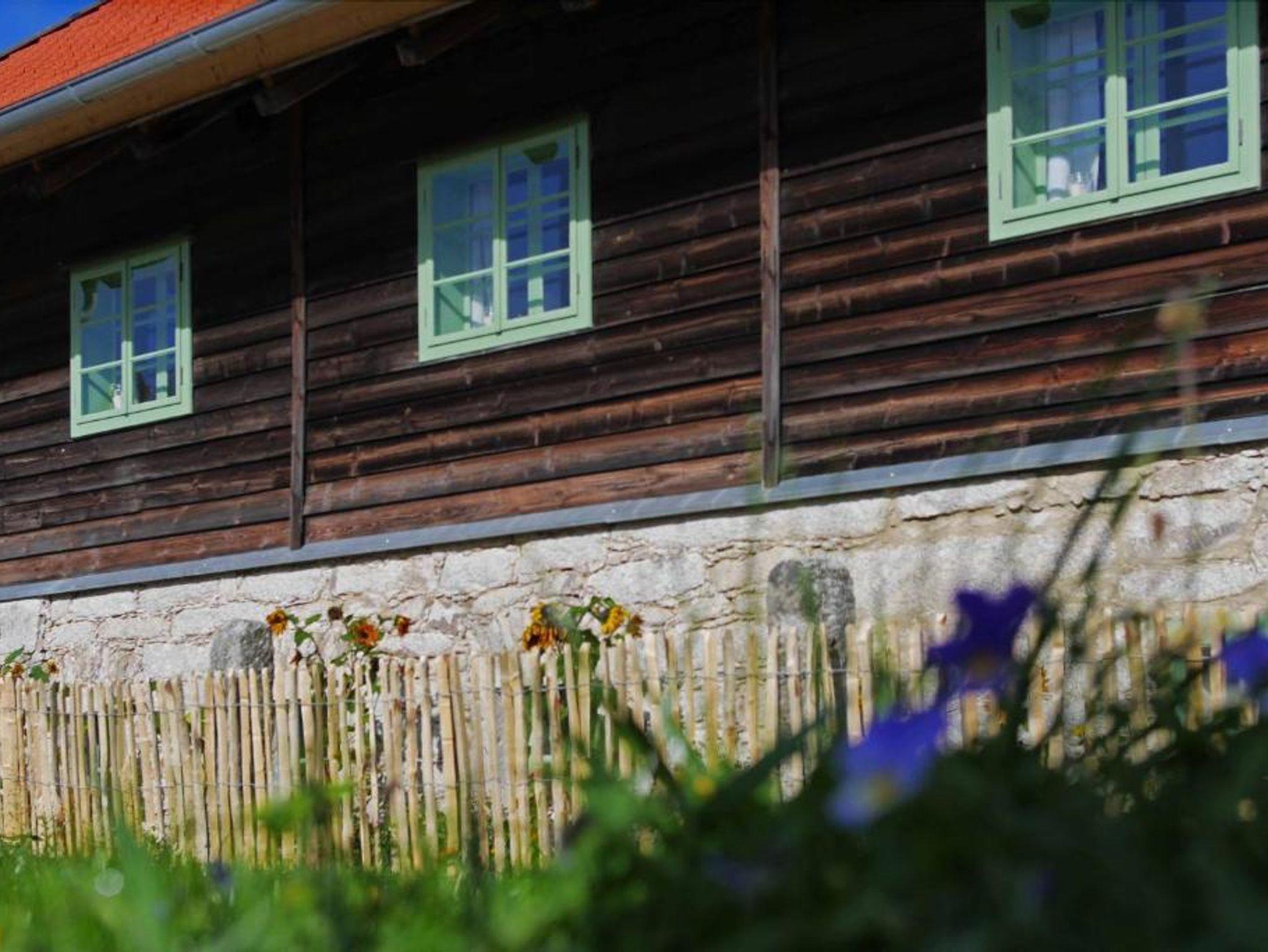Im Außenbereich ist vor dem Haus ein typischer kleiner Bauerngarten angelegt, bestückt mit Blumen und Kräutern. Hinter dem Haus findet sich eine großzügig angelegte Terrasse, ein Lagerfeuer/ Grillplatz und eine große Spielwiese für Fußball, Volleyball und ähnliches.