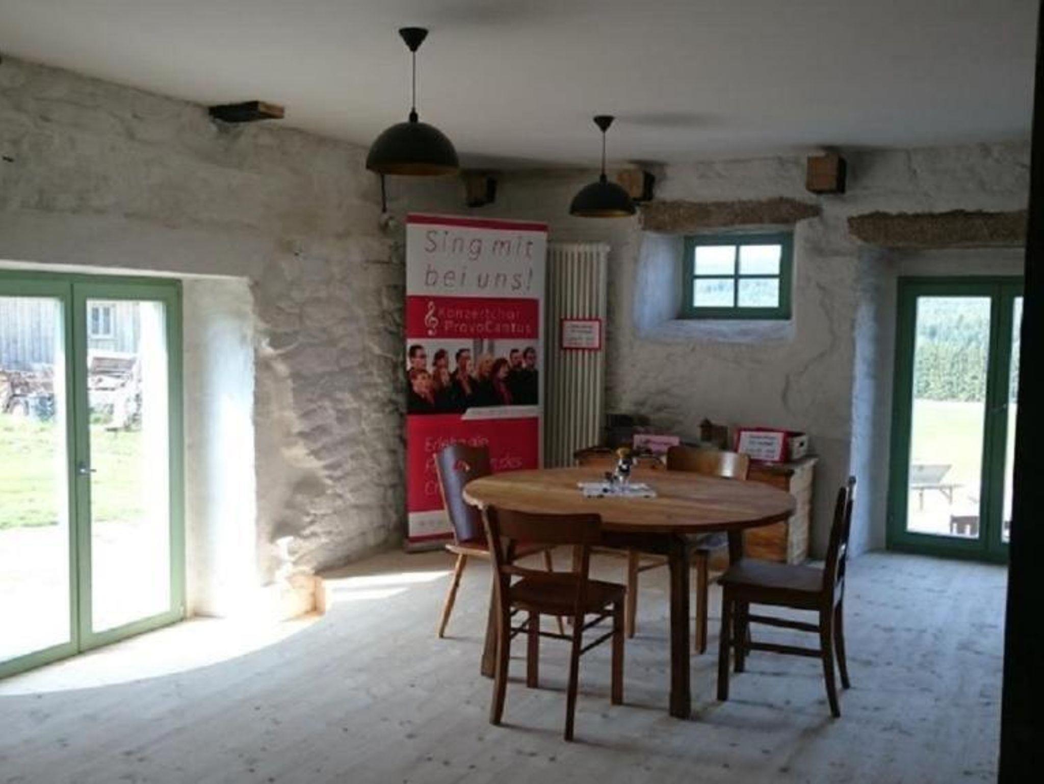 Im Erdgeschoss befindet sich auch noch ein ca. 68 m² großer Seminarraum (ehemals Kuh- und Saustall), in dem leicht 40 Personen tagen können. Ebenfalls im Erdgeschoss gelegen schließt sich ein kleiner Saunabereich zum Entspannen an.