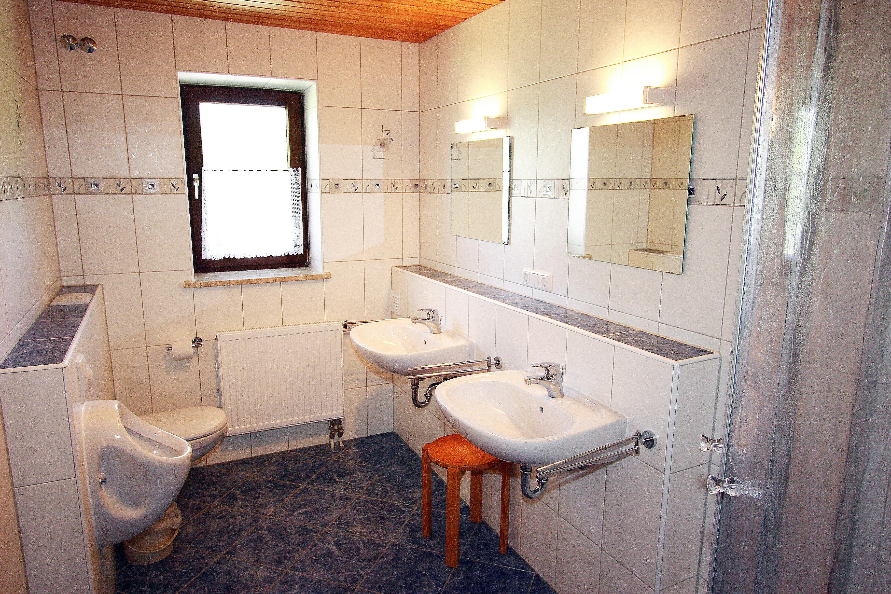 Im Parterre 1 behindertengerechtes Schlafzimmer mit 2 Einzelbetten und ein Etagenbett, dazu vor dem Zimmer im Vorraum ein Behindertenwaschbecken, daneben das WC, zusätzlich 1 Behinderten-WC und eine geräumige Behindertendusche auf dem Flur.