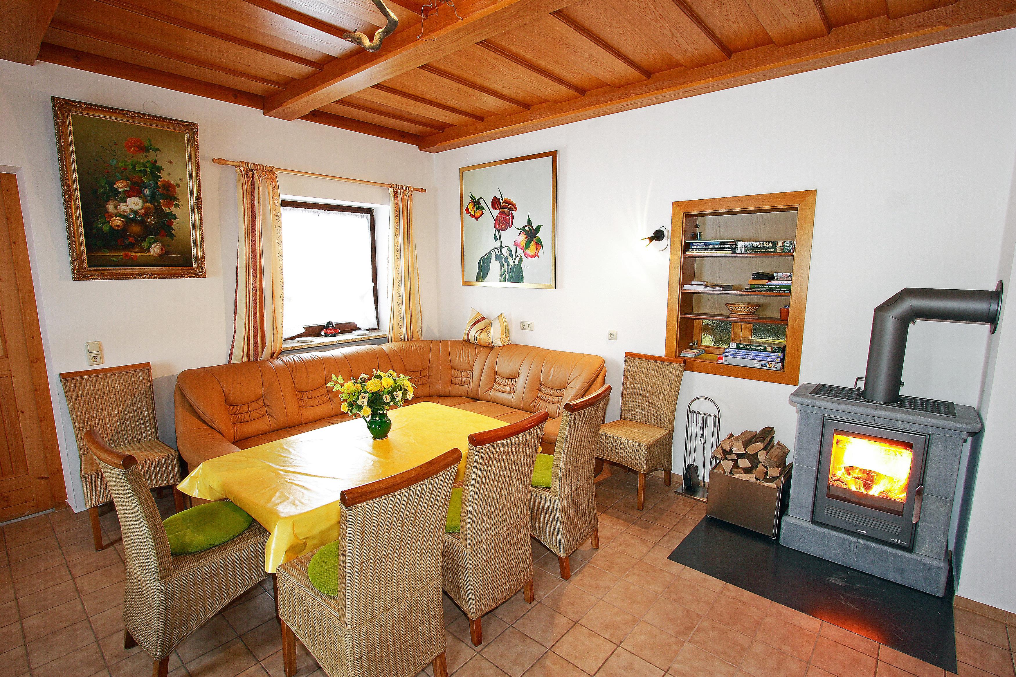 Das gemütliche Kaminzimmer für den Plausch in der kleinen Runde hat 1 Polstersitzgruppe mit großem Tisch in einer großen Sitzrunde, dazu noch eine Polsterecke mit kleinem Tisch und den Wärme – und Gemütlichkeit ausstrahlenden und hochwertigen Specksteinofen und einen neuen Flachbildschirm an der Wand, da bleiben keine Wünsche offen (!).