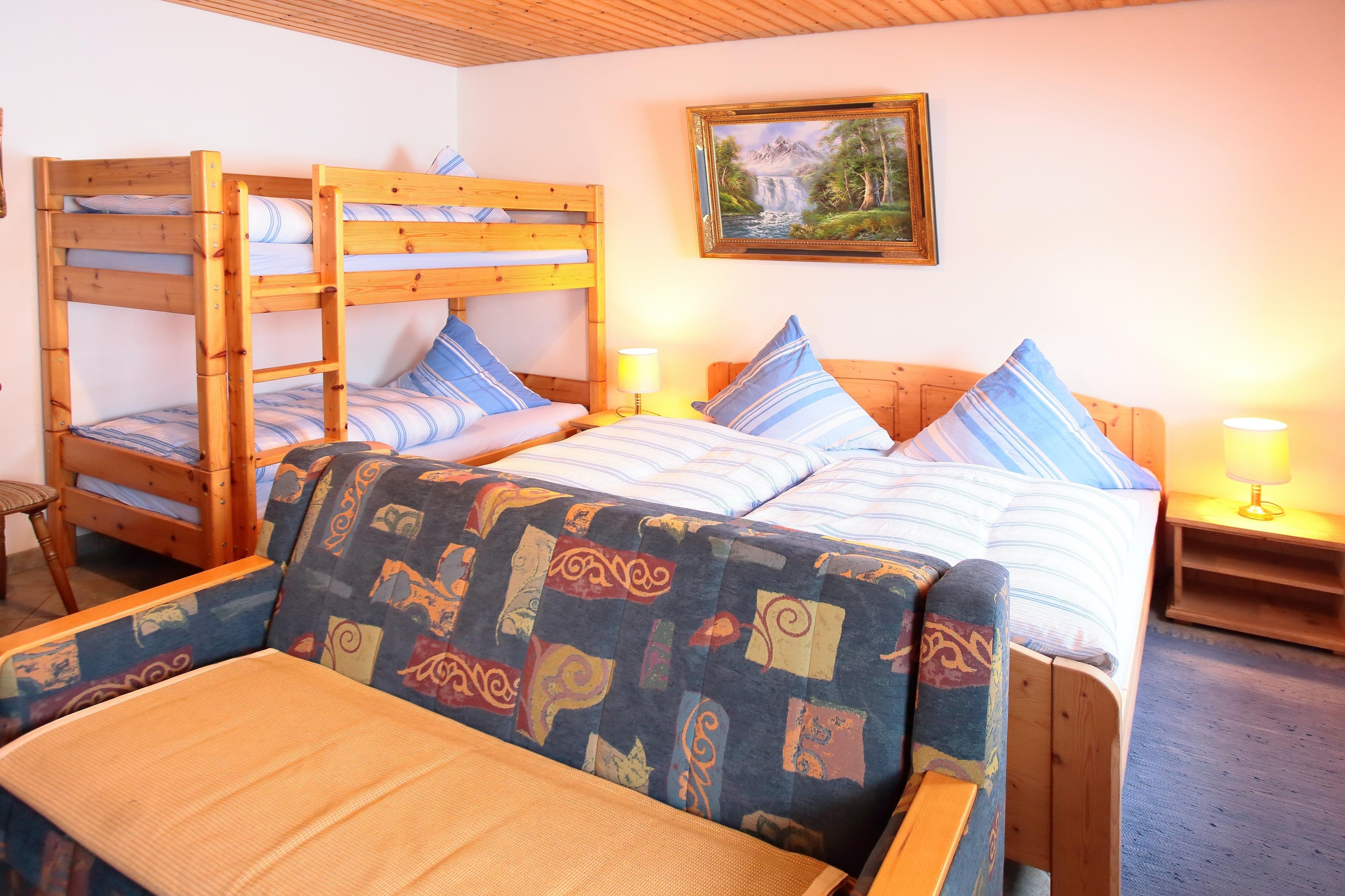 1 Zimmer mit 2 Einzelbetten und Etagenbett 90 x 200, behindertengerecht.