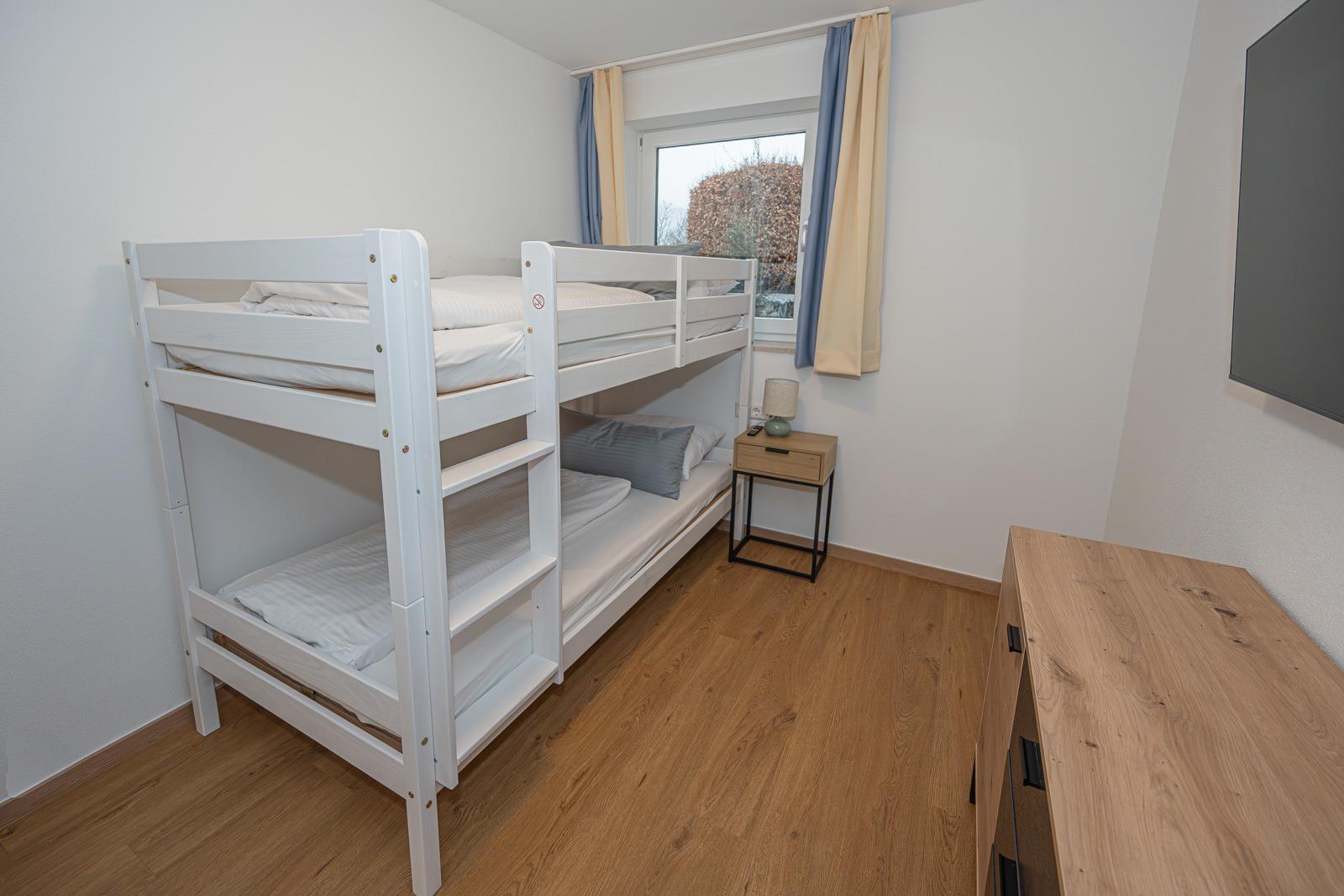 Dieses gemütliche und moderne Apartment mit eigenem Eingang bietet Ihnen alles, was Sie für einen entspannten Aufenthalt benötigen. Es teilt sich in ein großzügiges Schlafzimmer mit einem Doppelbett und ein kleineres Zimmer mit Stockbett auf - ideal für Paare, Familien oder Freunde. Die neu und vollwertig ausgestattete Küche lädt zum Kochen ein und bietet alle Annehmlichkeiten für einen komfortablen Aufenthalt im Wohn- und Essbereich. Ebenfalls gehört zu dem Apartment ein neu renoviertes Badezimmer mit Dusche, Badewanne und ein separates WC.
