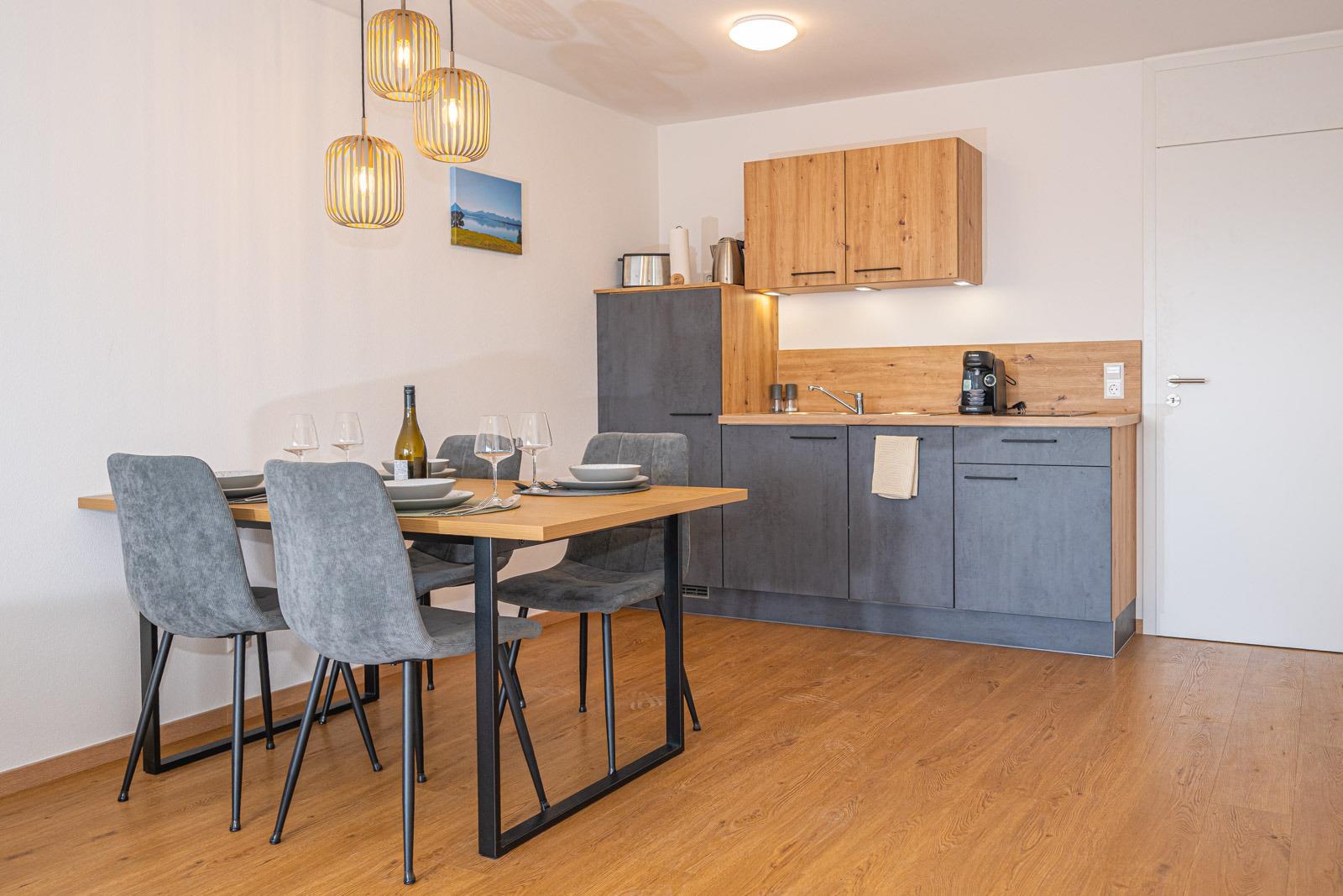 Dieses großzügige Apartment mit Balkon bietet Ihnen alles, was Sie für einen entspannten Aufenthalt benötigen. Es verfügt über einen eigenen Flur, der Sie herzlich willkommen heißt, sowie zwei gemütliche Schlafzimmer, jeweils mit eigenem Bad - perfekt für Familien, Paare oder Freunde, die gemeinsam reisen. Der große Wohnbereich ist das Herzstück des Apartments. Hier finden Sie eine neue, moderne Küche, die zum Kochen und Verweilen einlädt, sowie einen gemütlichen Sitzbereich, der eine warme und einladende Atmosphäre schafft. Große Fenster lassen viel Tageslicht herein und bieten einen herrlichen Blick auf die umliegenden Allgäuer Berge.