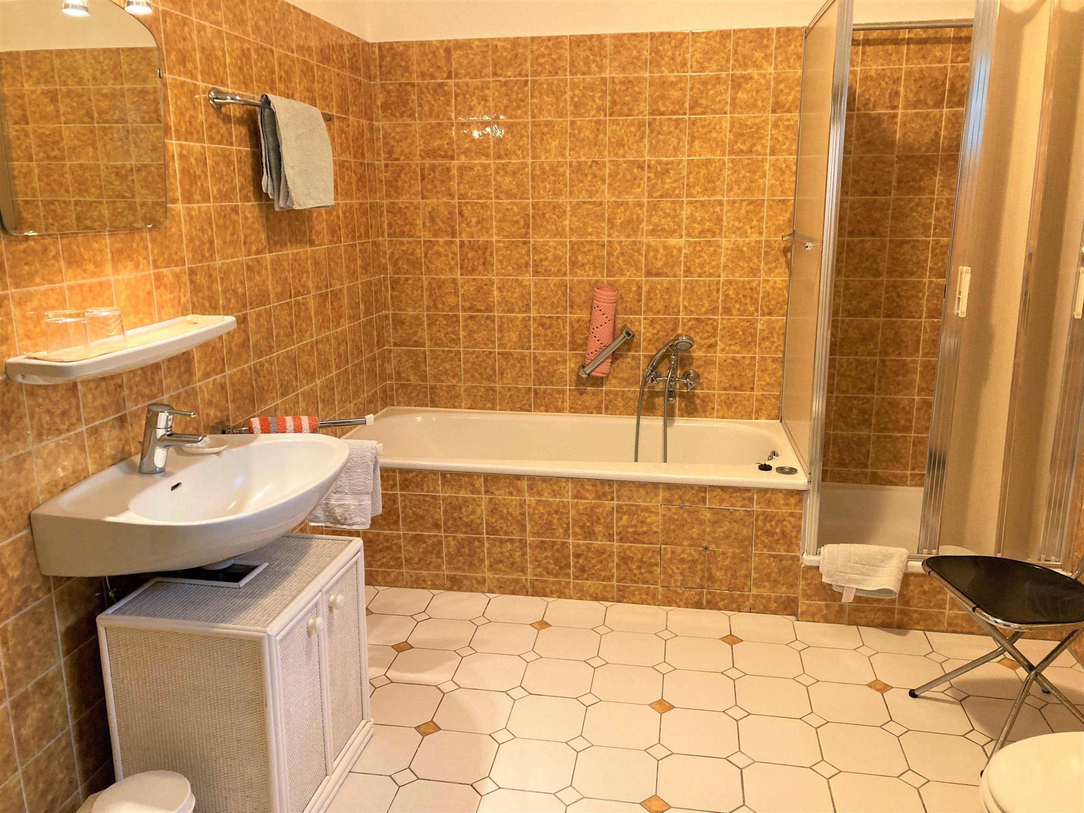 Großzügiges Badezimmer mit Wanne, Dusche, WC, Waschtisch, Fön, ehrwürdiger Miele Waschmaschine ( nur Mitbenutzung).