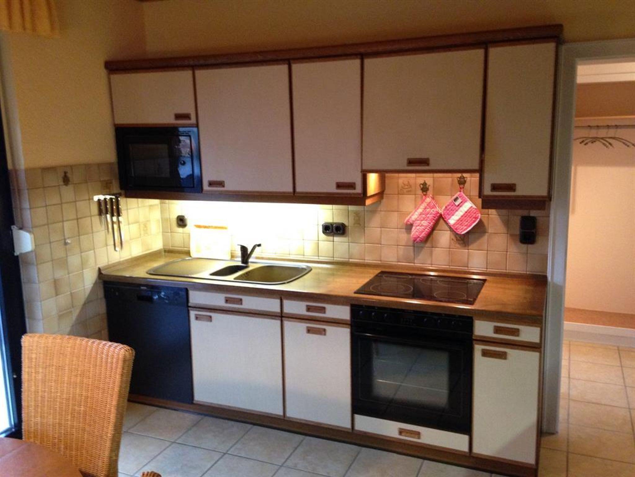 Das Wohnzimmer verfügt neben dem üblichen Mobiliar und TV über einen Ofen, mit dem an kalten Tagen kuschelig geheizt werden kann. Die Küche ist mit Geschirr voll ausgestattet und verfügt über Ceran Kochfeld, Herd, Mikrowelle und Kühlschrank. Im Schlafzimmer stehen neben den zwei Einzelbetten mit Nachtschrank ein geräumiger Kleiderschrank und eine Kommode zur Verfügung. Das Badezimmer verfügt über eine ebenerdige Dusche, WC und einem geräumigen Waschtisch mit großem Spiegel. Für zwei zusätzliche Schlafplätze, steht im Wohnzimmer eine ausziehbare Schlafcouch mit Federkern-Matratze zur Verfügung. Vom Wohnzimmer aus gelangt man auf eine kleine, teilweise überdachte, Terrasse mit Sitzgelegenheiten. Über die Küche gelangt man auf einen voll überdachten Balkon der ebenfalls über Sitzgelegenheiten verfügt. Von hier aus ist auch ein Zugang zum Hof und dem abschließbaren Abstellraum für Fahrräder.