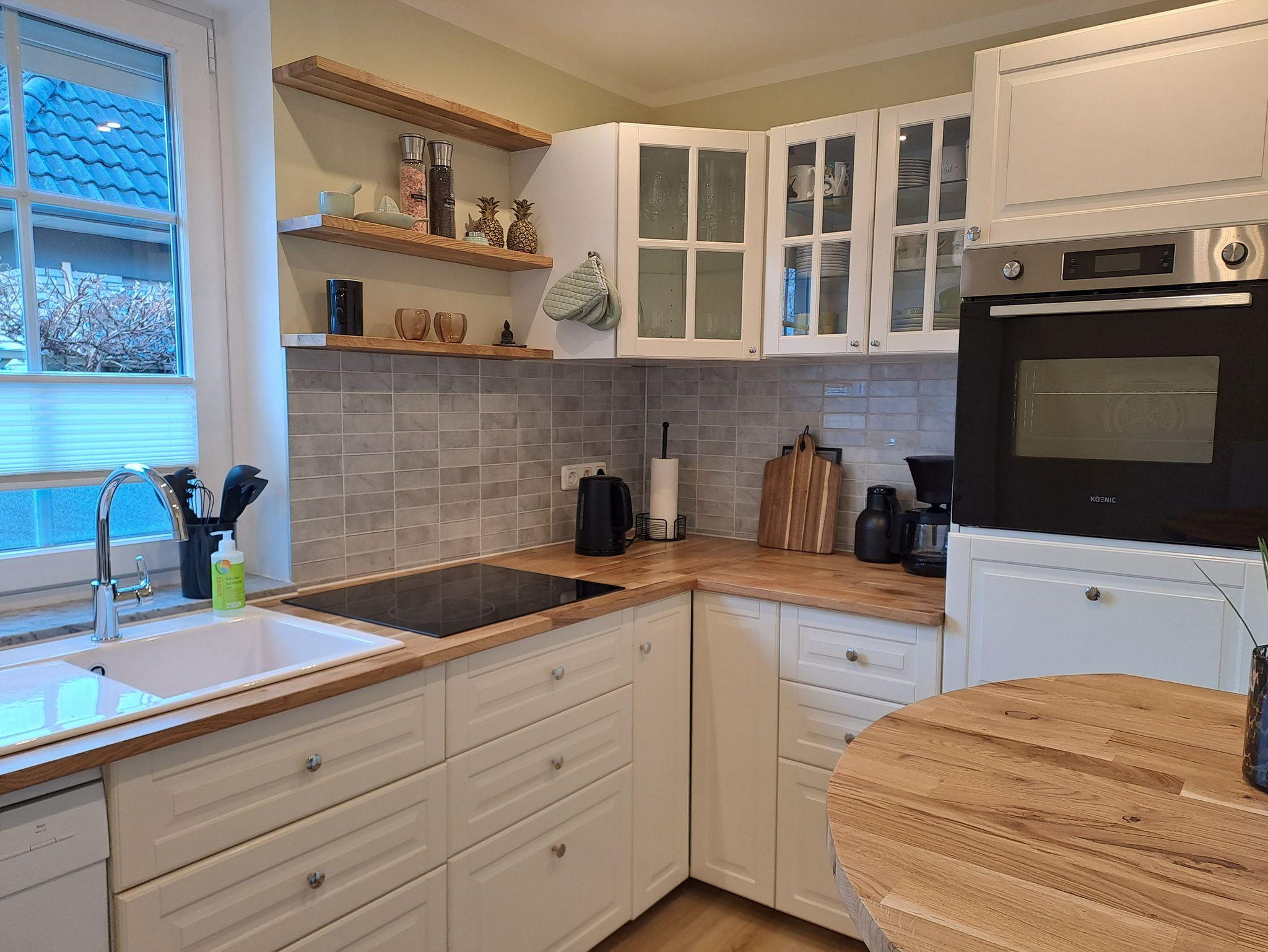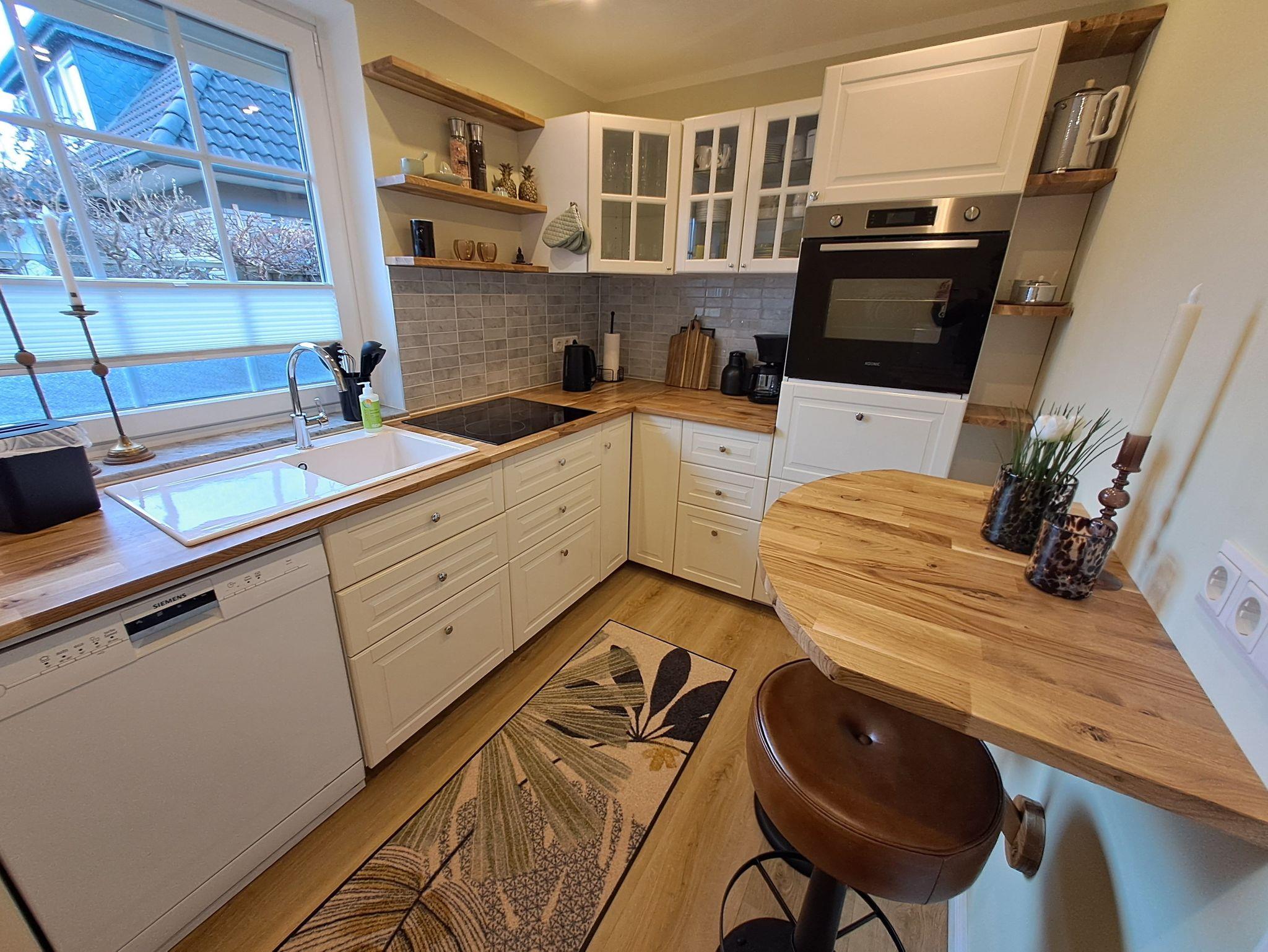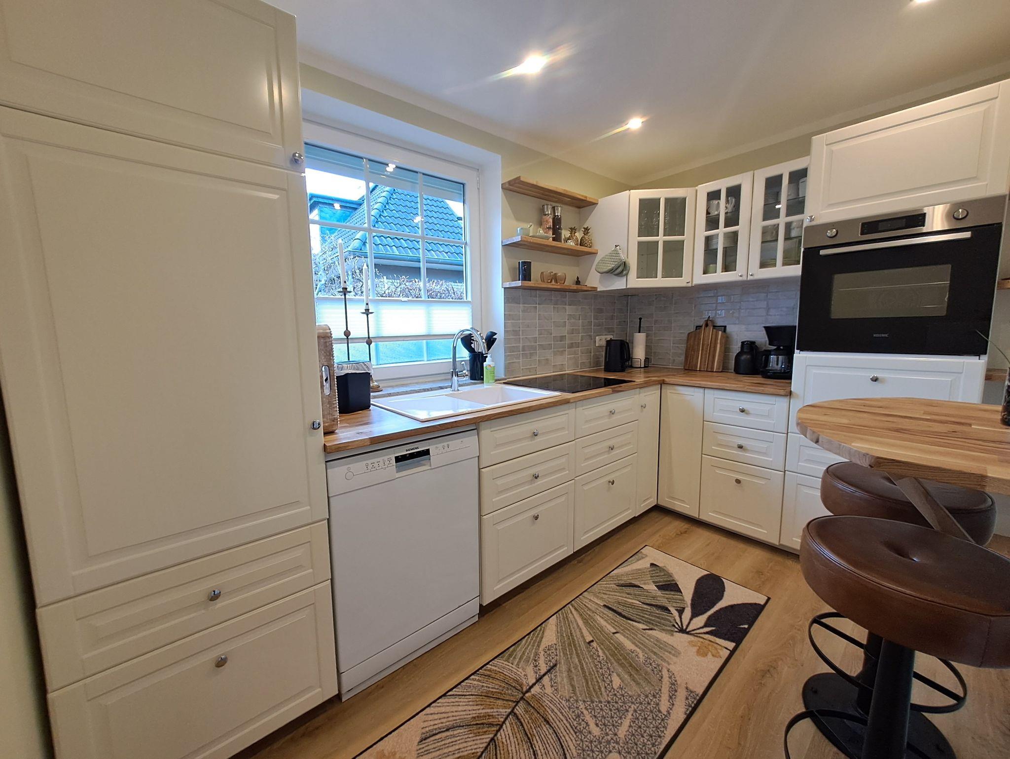 Die Küche ist gut ausgestattet und bietet neben Toaster und Kaffeemaschine auch eine Gefriermöglichkeit. Im Hauswirtschaftsraum werden eine Waschmaschine und Trockner nur kostenfreien Nutzung angeboten.