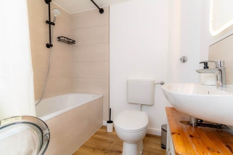 Besonders praktisch: Die Unterkunft ist verkehrsgünstig gelegen. In nur wenigen Minuten erreichen Sie den Flensburger Innenstadtbereich sowie den Hafen. Auch die dänische Grenze ist nur wenige Meter entfernt. Eine Bushaltestelle mit Verbindung zum Bahnhof befindet sich nur etwa 400 Meter entfernt und ist bequem zu Fuß erreichbar.