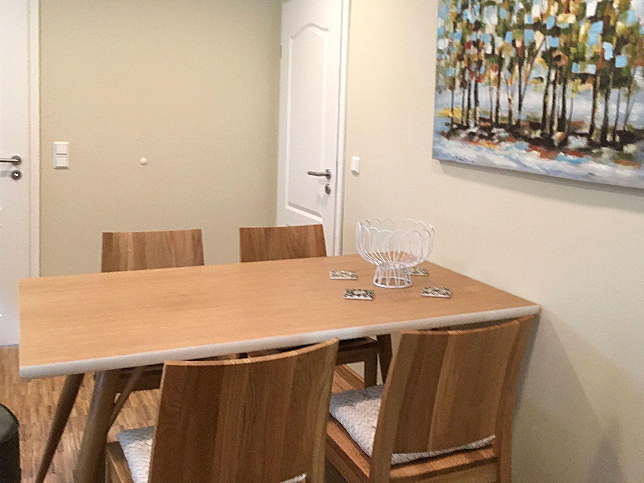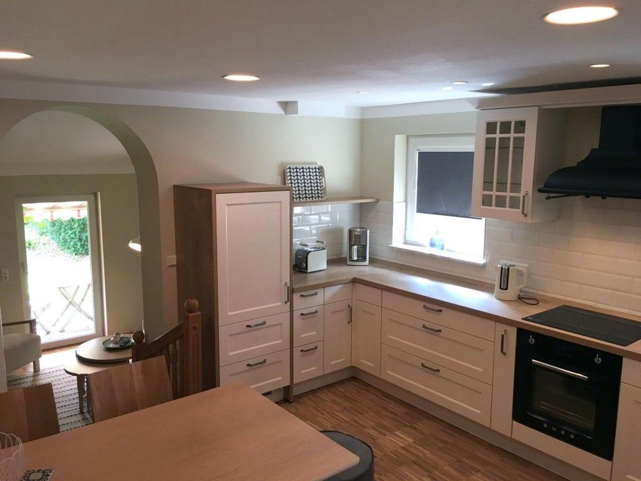 Küche: Im Landhausstil eingerichtet. Eichenholzdielen in der ganzen Ferienwohnung. Die Küche ist mit Spülmaschine, Induktionskochfeld, Backofen, Dunstabzugshaube, Kaffeemaschine, Toaster, Wasserkocher, Kühlschrank mit Gefrierfach ausgestattet. Am großen Tisch können Sie gemütlich zu viert sitzen, essen oder einen schönen Spieleabend verbringen.