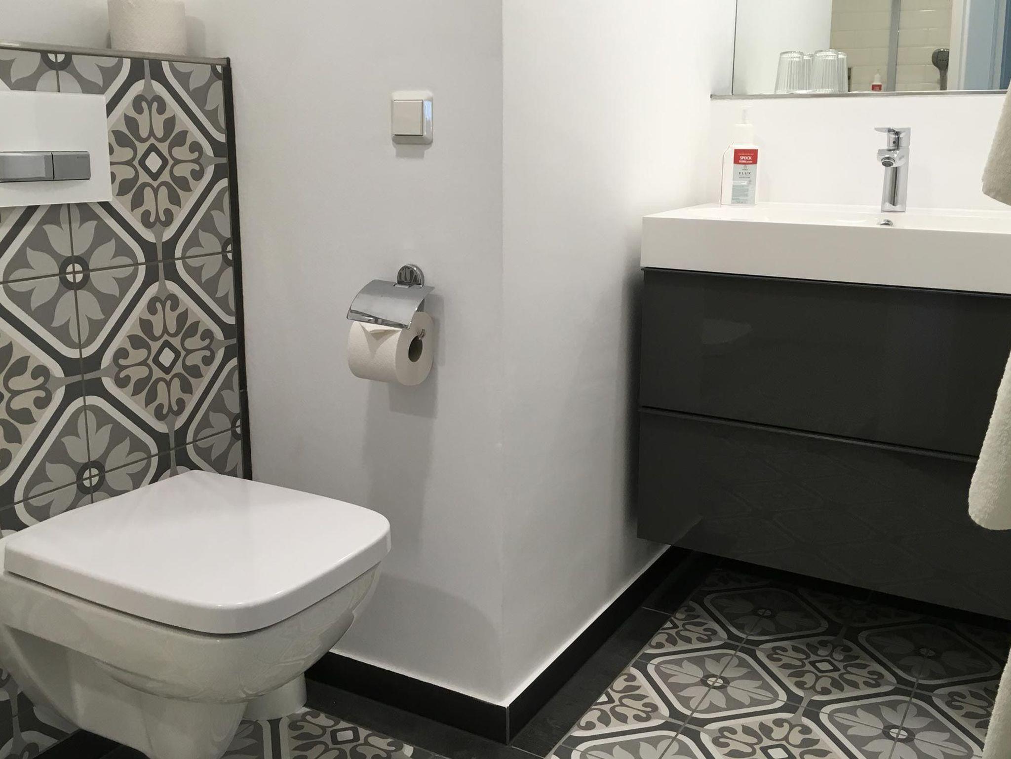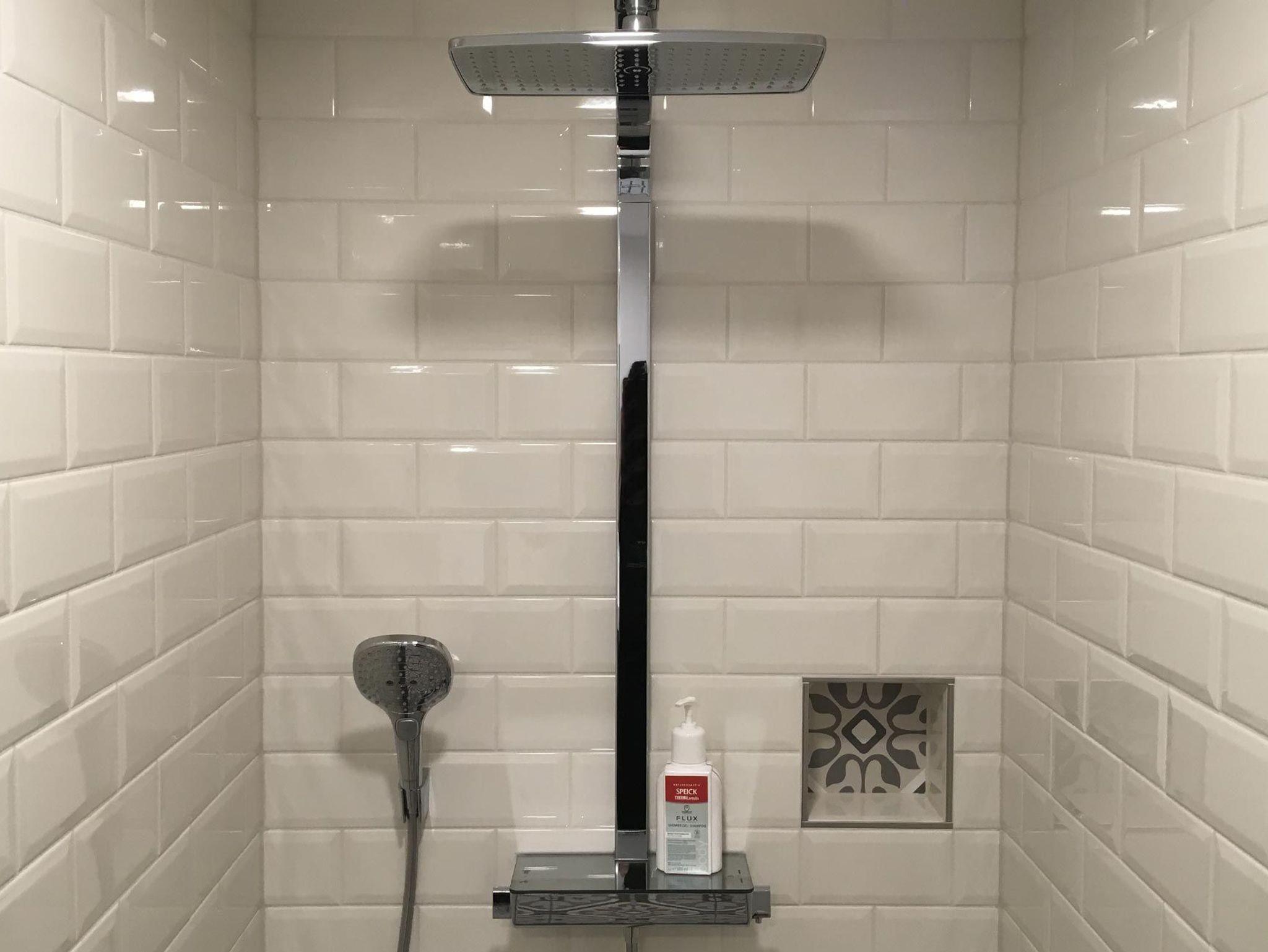 Badezimmer: Begehbare, geräumige Dusche mit Fußbodenheizung, Hänge-WC, Spültisch & Rainshowerdusche mit Handbrause, großer Spiegel, Kosmetikspiegel, Handtuchtrockner.