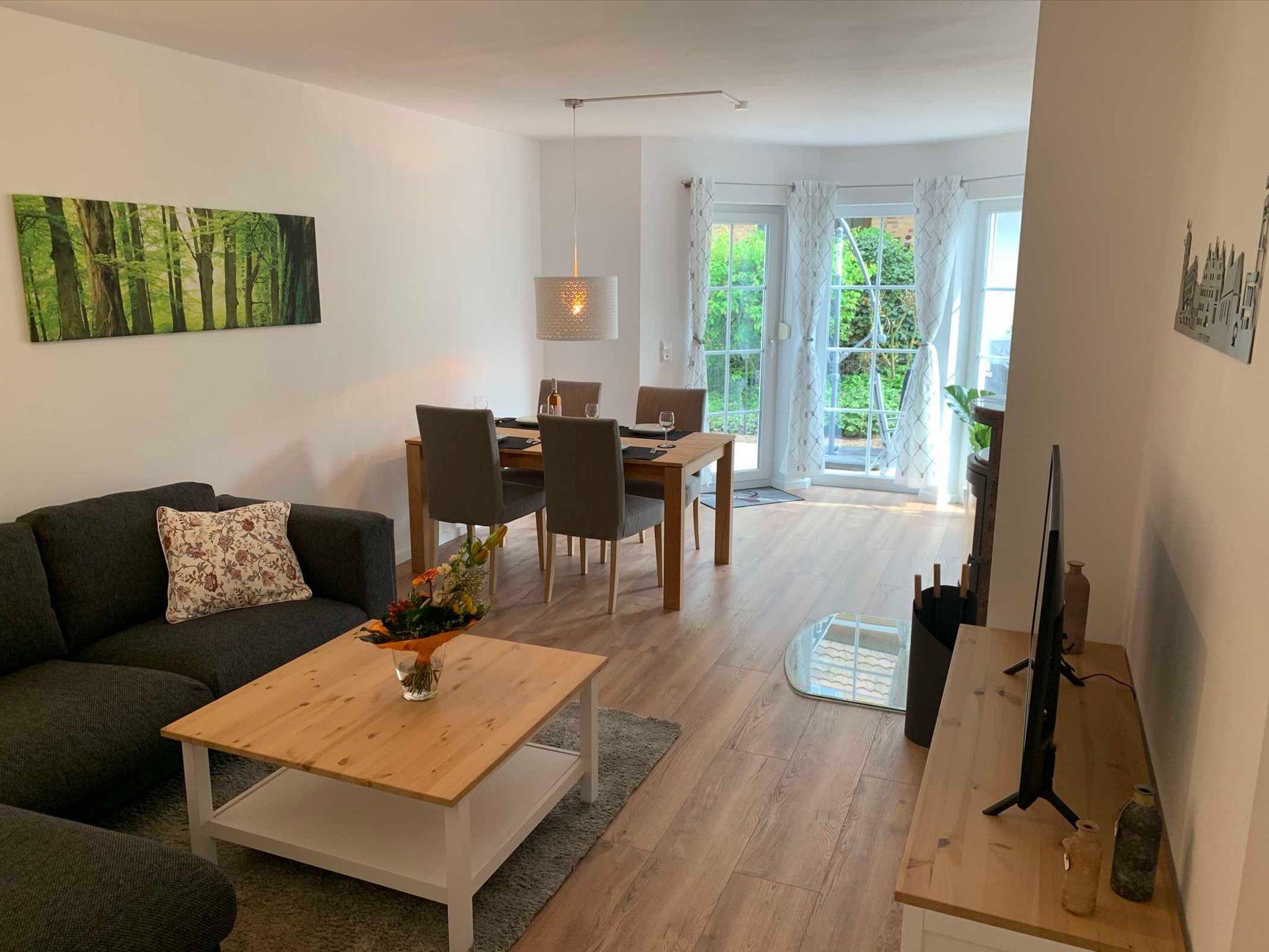 Die Ferienwohnung wurde Anfang 2020 neu und modern eingerichtet. Ob zu zweit oder mit der ganzen Familie inklusive Hunde ist die Ferienwohnung mit 66 m² perfekt. Es ist eine Nichtraucher Wohnung mit separatem barrierefreiem Eingang, Kamin und eigenen eingezäunten Garten. Sowie einer großzügigen Terrasse welche zum Verweilen einlädt. Einkaufsmöglichkeiten befinden sich in ca. 200 m Entfernung. Zwei hochwertige E-Bikes können gemietet werden.