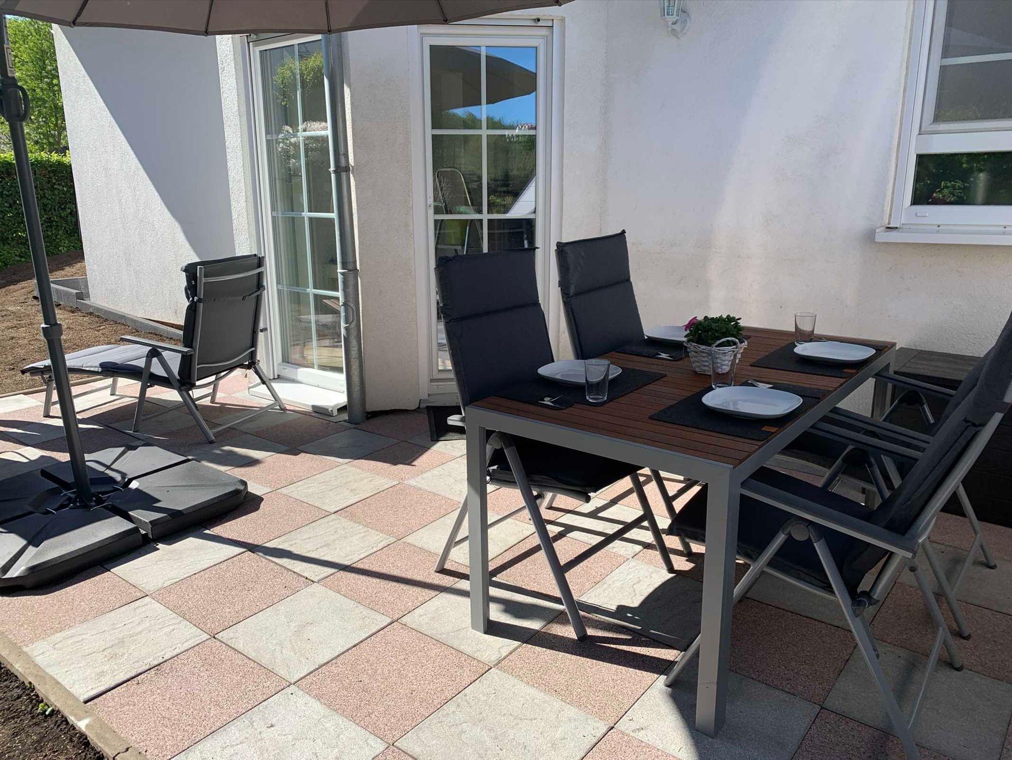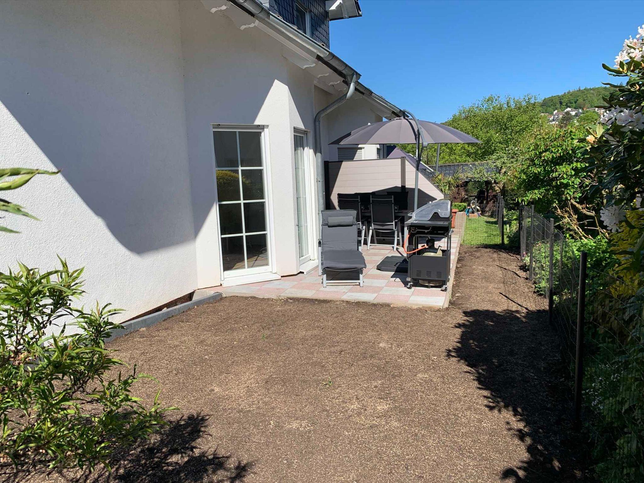Eine große Terrasse mit eigenen eingezäunten Gartenanteil und die bequemen Gartenmöbel laden zum Entspannen ein.