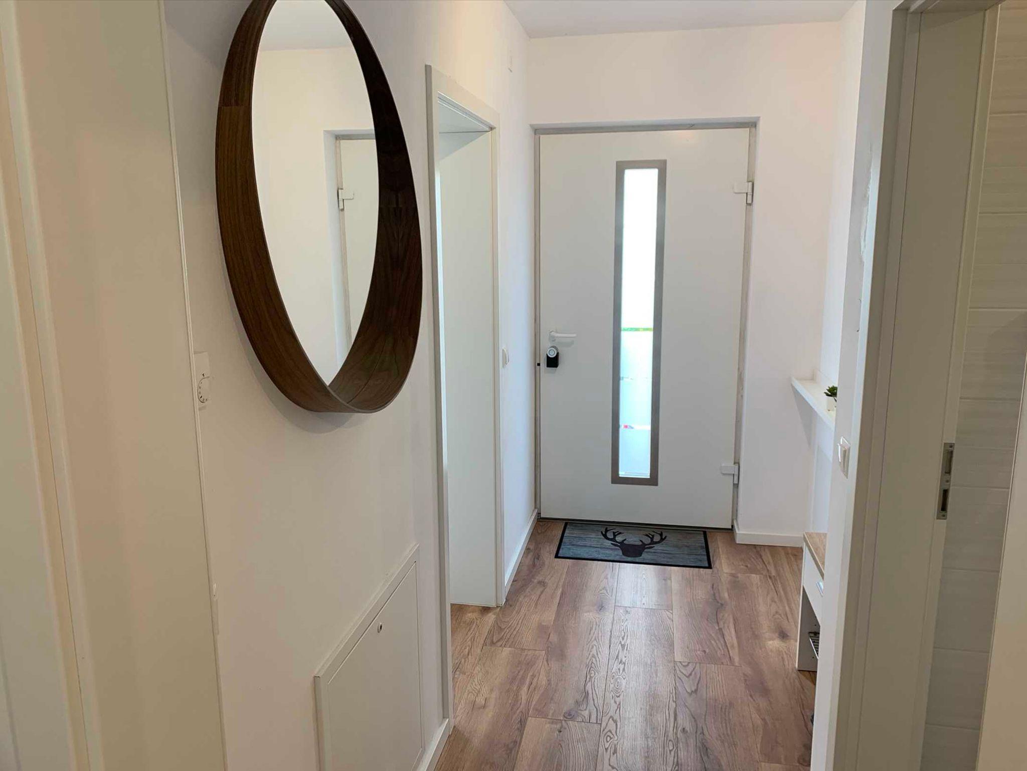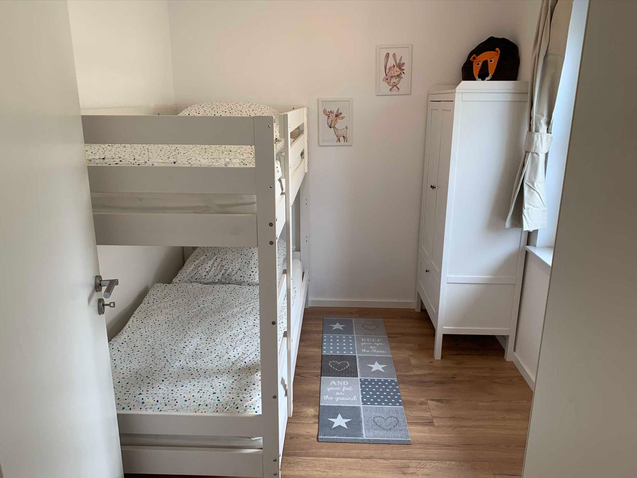 Durch den Flur gelangen Sie zum Kinderzimmer und das Badezimmer. Das Kinderschlafzimmer ist kindgerecht eingerichtet und verfügt über ein Hochbett und eine Wickelmöglichkeit. Das Badezimmer ist mit einer bodengleichen Dusche und einem großem Waschtisch ausgestattet. Ebenfalls befindet sich dort der Waschtrockner.