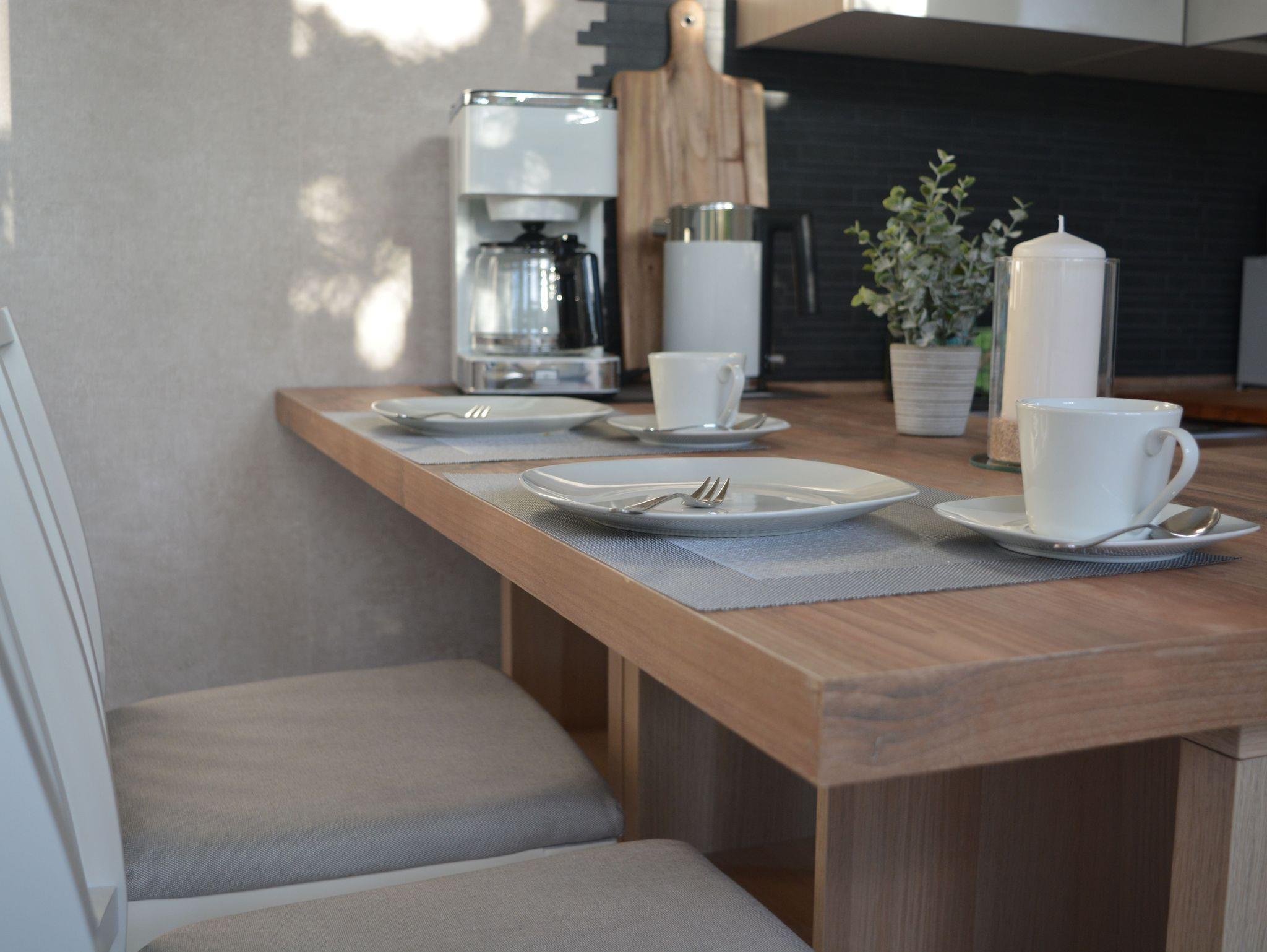 angrenzende Essplatz mit 2 Barhockern lädt zum ausgiebigen Essen.ein.