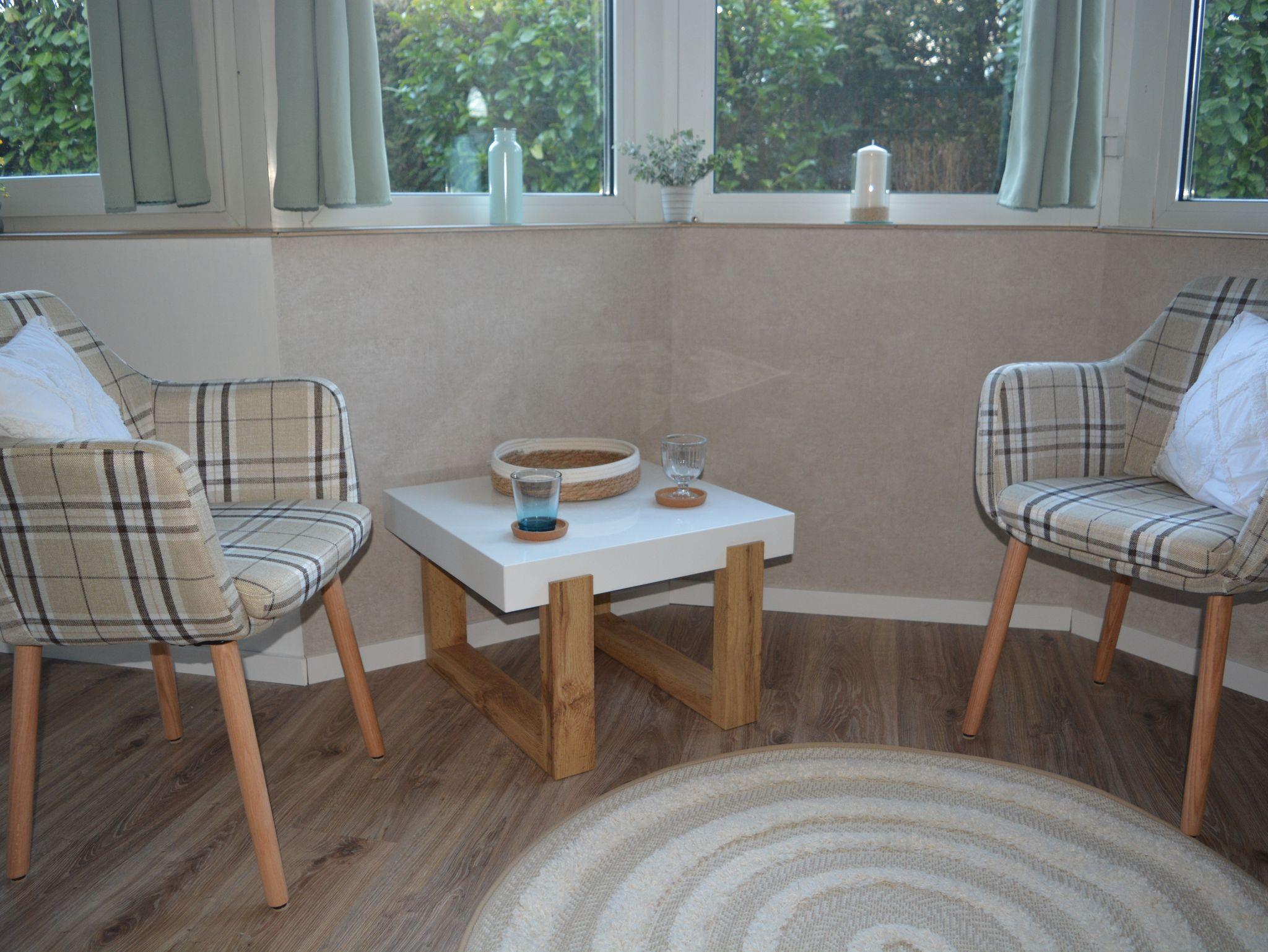 mit 2 Sesseln und einem Couchtisch. Zur Unterhaltung steht hier ein