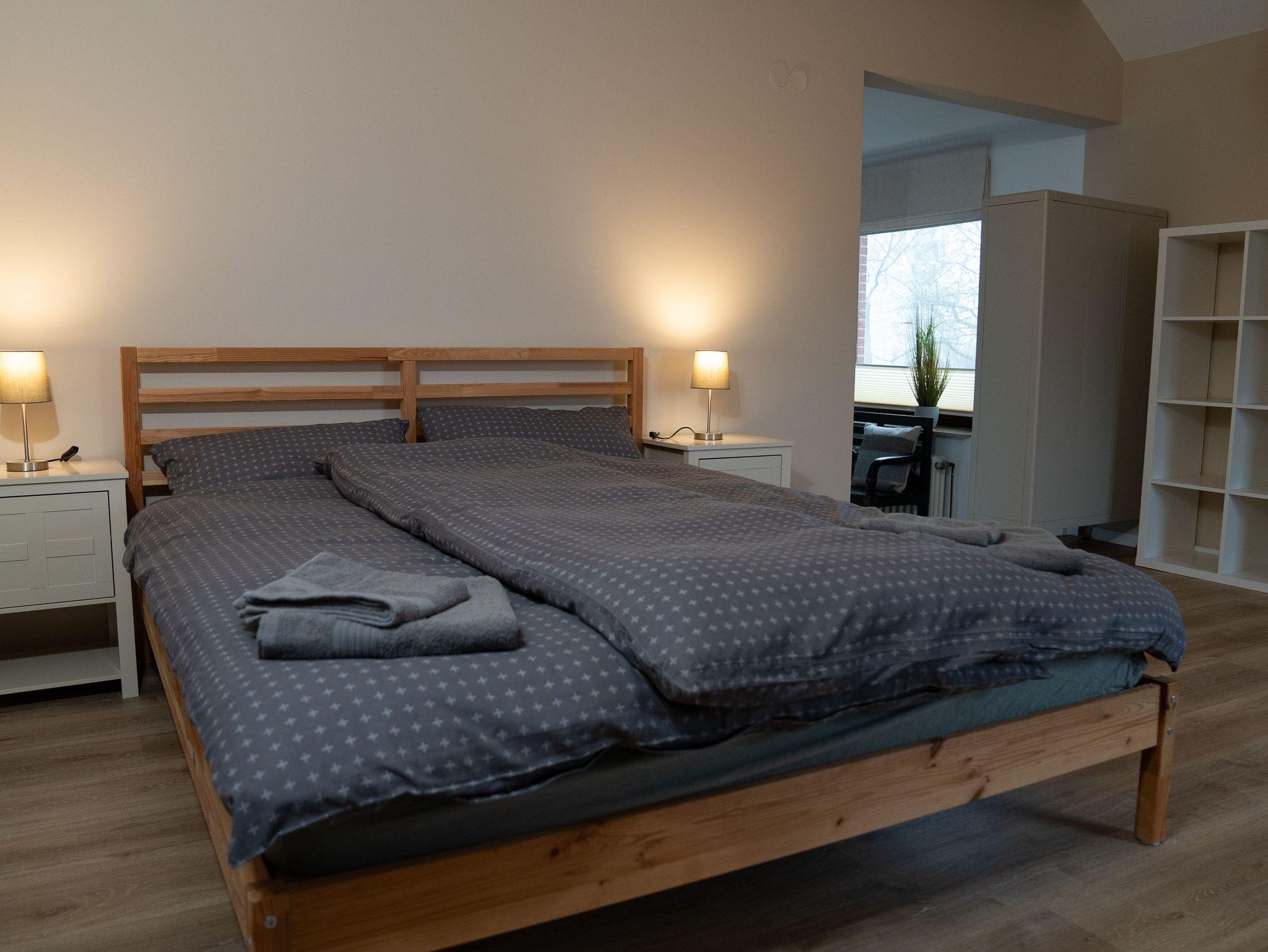 Im großzügig gestalteten Obergeschoss befindet sich das geräumige offen zugängliche Schlafzimmer mit einem Doppelbett und das Badezimmer. Beide Etagen sind jeweils in zwei Ebenen aufgeteilt, wodurch das schöne Wohnambiente der Unterkunft zusätzlich betont wird. Jeweils zwei Stufen trennen diese Ebenen.