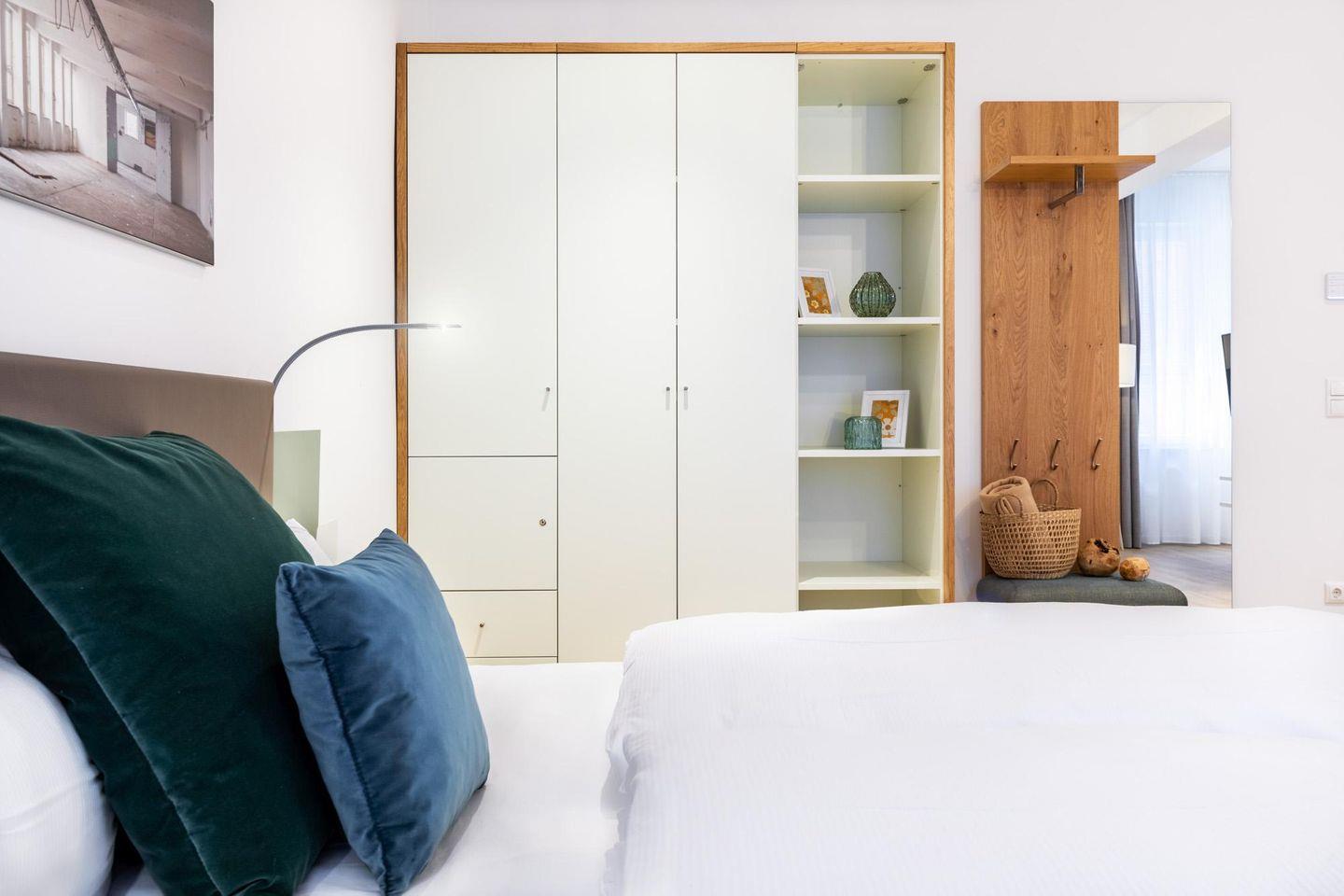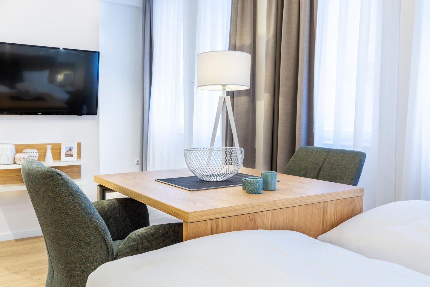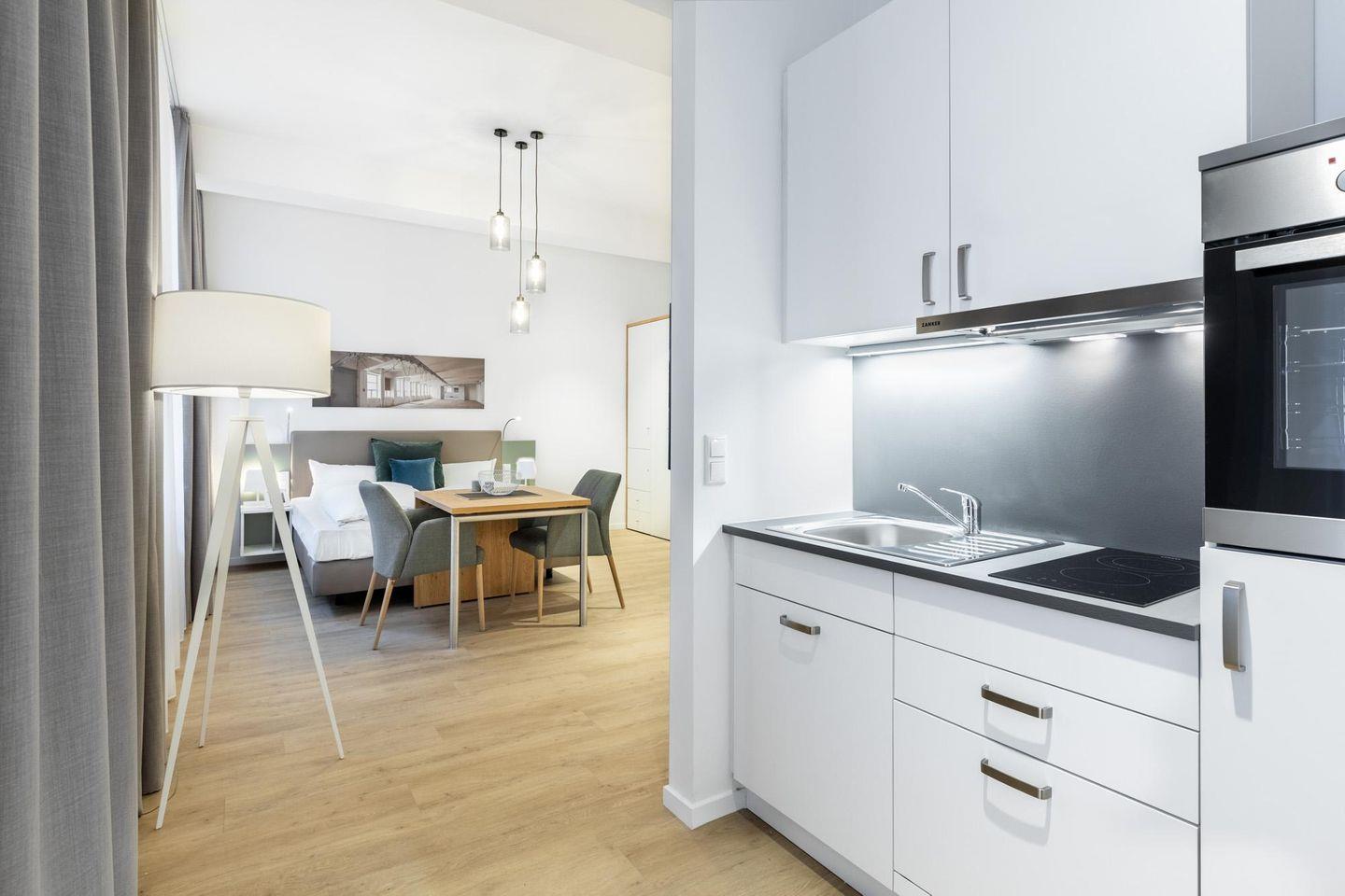 Das helle und moderne Nichtraucher-Apartment verfügt über Fußbodenheizung, kostenfreies WLAN und eine voll ausgestattete offene Küche mit Geschirrspüler, Kühlschrank, einen Herd mit 2 Glaskeramikkochfeldern und Backofen, Kaffeemaschine, Toaster, Wasserkocher und Mixstab. Im kombinierten Wohn-Schlafbereich befinden sich ein komfortables Boxspring-Doppelbett (1,80 x 2,00 m), ein Flatscreen-TV (40 Zoll) und eine Musikanlage. Das Apartment verfügt über einen Safe für Laptopgröße bis ca. 17 Zoll. Im modernen Badezimmer stehen euch eine ebenerdige Regendusche, ein Waschtisch, WC, ein Handtuchwärmer sowie ein Föhn zur Verfügung.