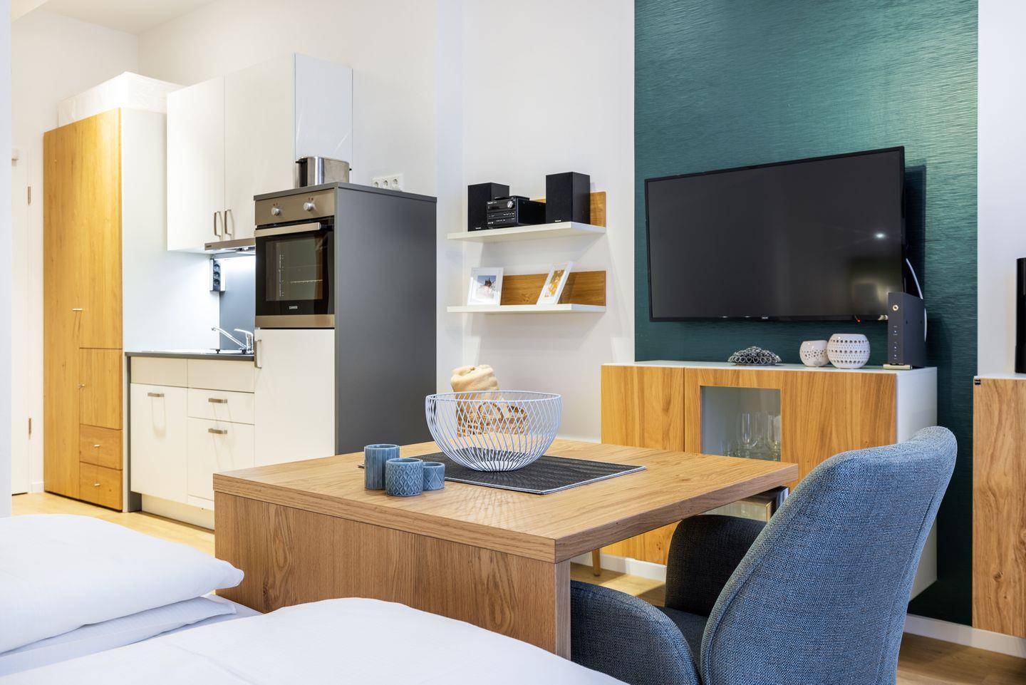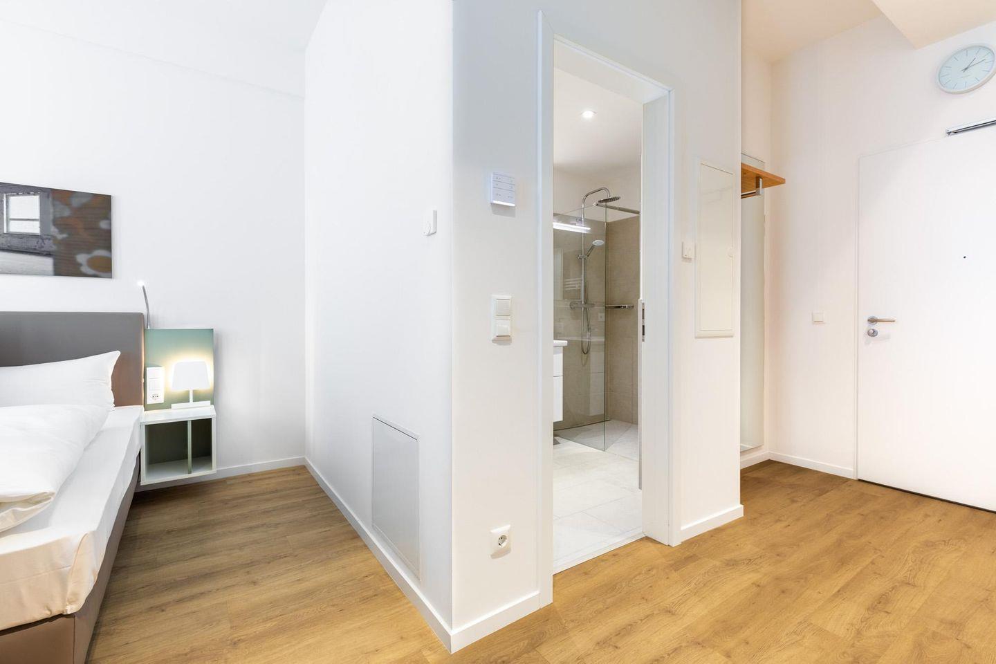 Das helle und moderne Nichtraucher-Apartment verfügt über Fußbodenheizung, kostenfreies WLAN und eine voll ausgestattete offene Küche mit Geschirrspüler, Kühlschrank, einen Herd mit 2 Glaskeramikkochfeldern und Backofen, Kaffeemaschine, Toaster, Wasserkocher und Mixstab. Im kombinierten Wohn-Schlafbereich befinden sich ein komfortables Boxspring-Doppelbett (1,80 x 2,00 m), ein Flatscreen-TV (40 Zoll) und eine Musikanlage. Das Apartment verfügt über einen Safe für Laptopgröße bis ca. 17 Zoll. Im modernen Badezimmer stehen euch eine ebenerdige Regendusche, ein Waschtisch, WC, ein Handtuchwärmer sowie ein Föhn zur Verfügung.