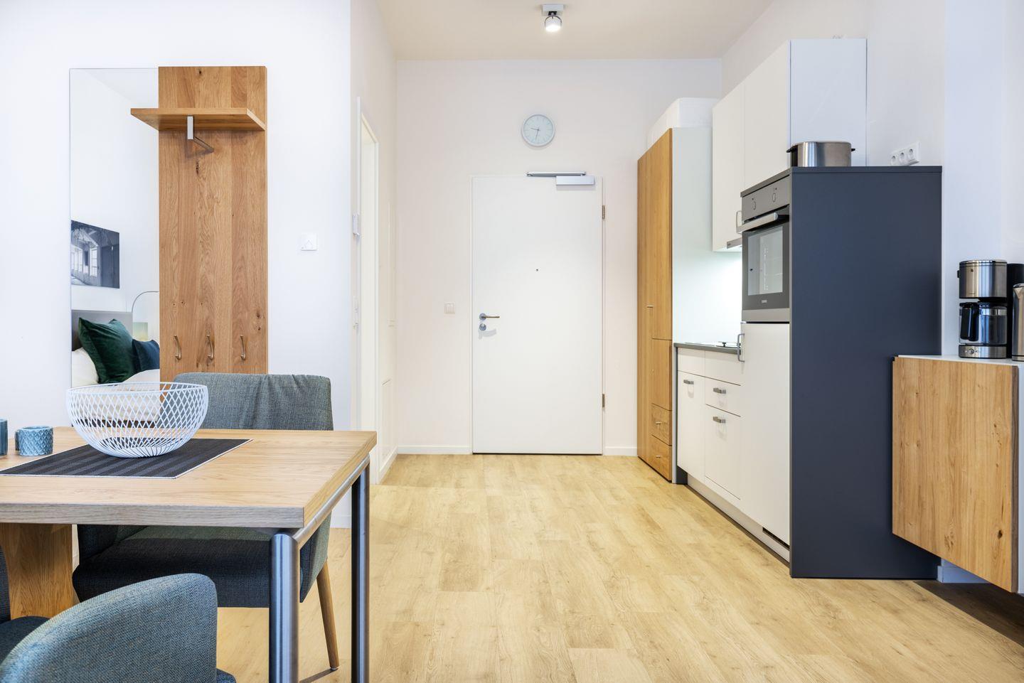Das helle und moderne Nichtraucher-Apartment verfügt über Fußbodenheizung, kostenfreies WLAN und eine voll ausgestattete offene Küche mit Geschirrspüler, Kühlschrank, einen Herd mit 2 Glaskeramikkochfeldern und Backofen, Kaffeemaschine, Toaster, Wasserkocher und Mixstab. Im kombinierten Wohn-Schlafbereich befinden sich ein komfortables Boxspring-Doppelbett (1,80 x 2,00 m), ein Flatscreen-TV (40 Zoll) und eine Musikanlage. Das Apartment verfügt über einen Safe für Laptopgröße bis ca. 17 Zoll. Im modernen Badezimmer stehen euch eine ebenerdige Regendusche, ein Waschtisch, WC, ein Handtuchwärmer sowie ein Föhn zur Verfügung.