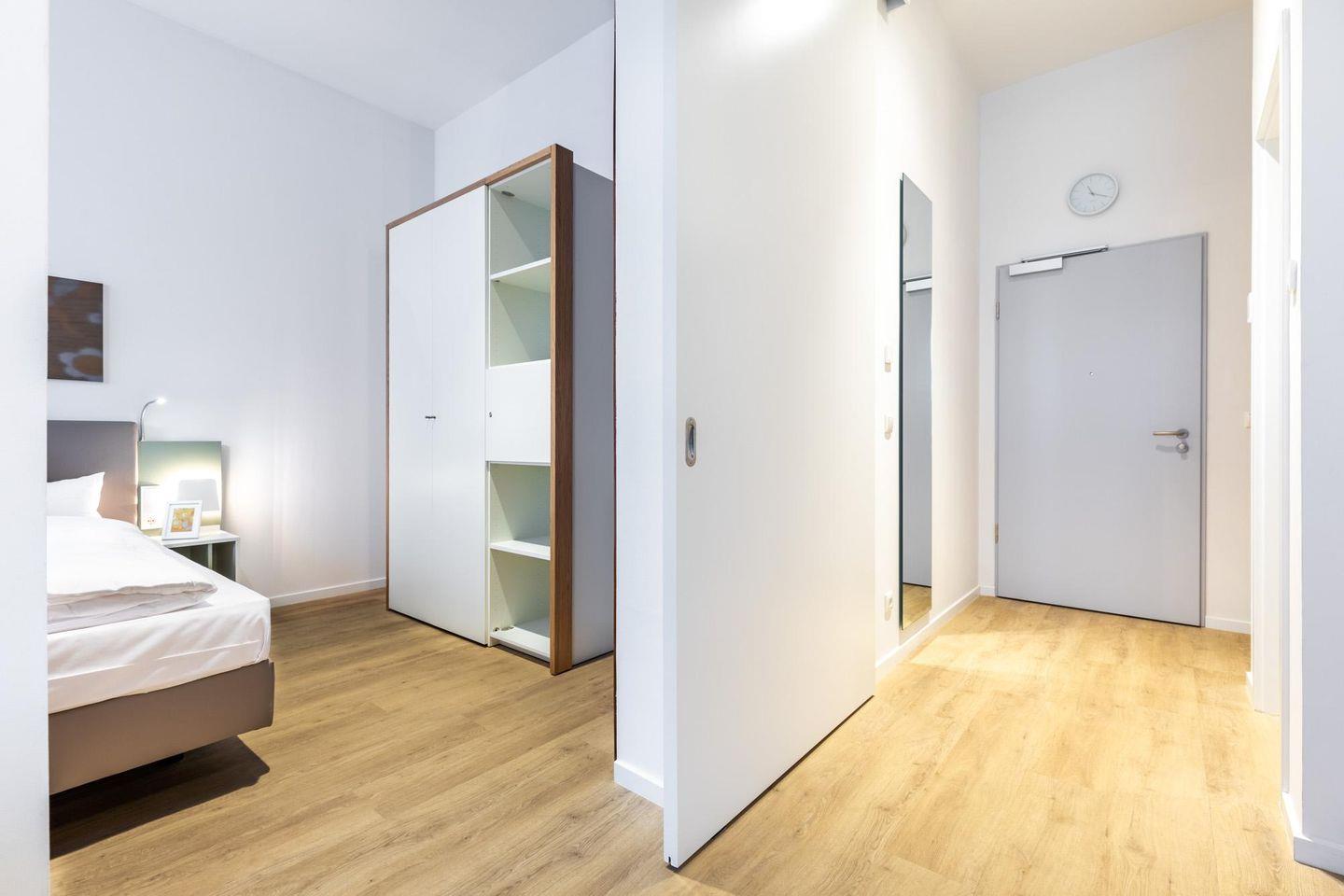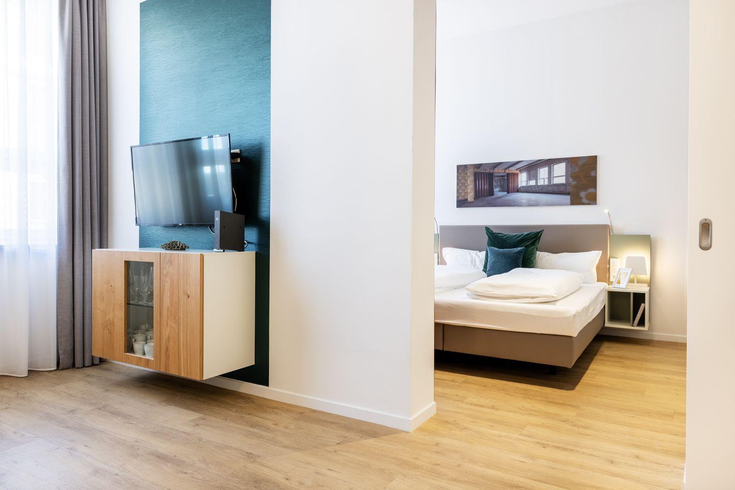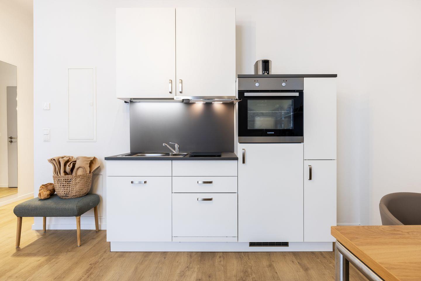 Das helle und moderne Nichtraucher-Apartment verfügt über Fußbodenheizung, kostenfreies WLAN und eine voll ausgestattete offene Küche mit Geschirrspüler, Kühlschrank, einen Herd mit 2 Glaskeramikkochfeldern und Backofen, Kaffeemaschine, Toaster, Wasserkocher und Mixstab. Im separaten Schlafzimmer befindet sich ein komfortables Boxspring-Doppelbett (1,80 x 2,00 m) und ein Flatscreen-TV (40 Zoll). Im kombinierten Wohn-Essbereich stehen euch ein Flatscreen-TV (40 Zoll) und eine Musikanlage sowie eine Einzelschlafcouch (1,20 x 1,95 m) zur Verfügung. Das Apartment verfügt über einen Safe für Laptopgröße bis ca. 17 Zoll. Im modernen Badezimmer befinden sich eine ebenerdige Regendusche, eine Badewanne, ein Waschtisch, WC, ein Handtuchwärmer sowie ein Föhn.