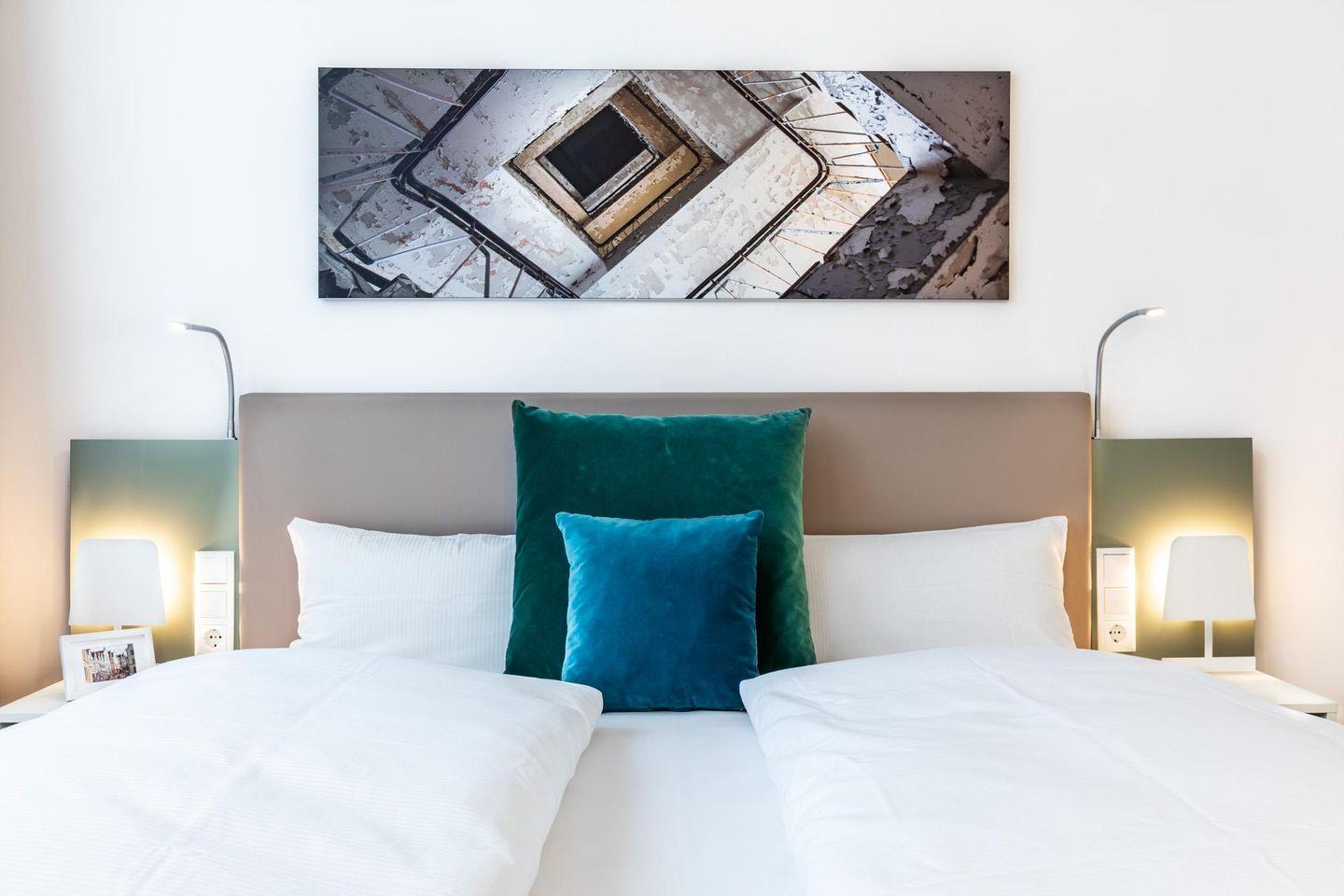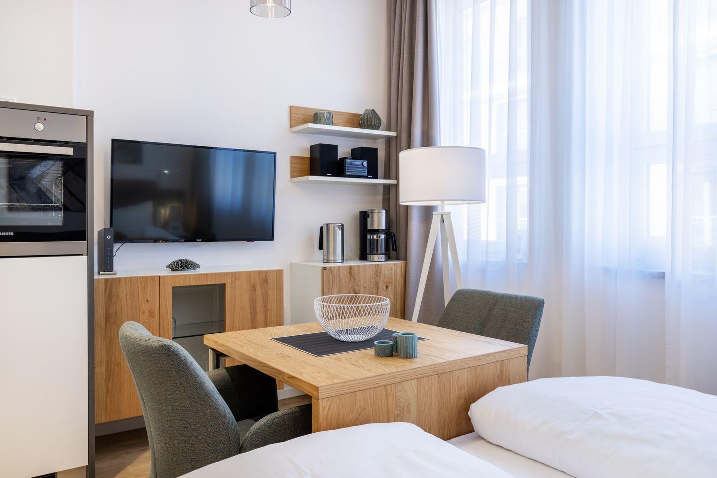 Das helle und moderne Nichtraucher-Apartment verfügt über Fußbodenheizung, kostenfreies WLAN und eine voll ausgestattete offene Küche mit Geschirrspüler, Kühlschrank, einen Herd mit 2 Glaskeramikkochfeldern und Backofen, Kaffeemaschine, Toaster, Wasserkocher und Mixstab. Im kombinierten Wohn-Schlafbereich befinden sich ein komfortables Boxspring-Doppelbett (1,80 x 2,00 m), ein Flatscreen-TV (40 Zoll) und eine Musikanlage. Das Apartment verfügt über einen Safe für Laptopgröße bis ca. 17 Zoll. Im modernen Badezimmer stehen euch eine ebenerdige Regendusche, ein Waschtisch, WC, ein Handtuchwärmer sowie ein Föhn zur Verfügung.