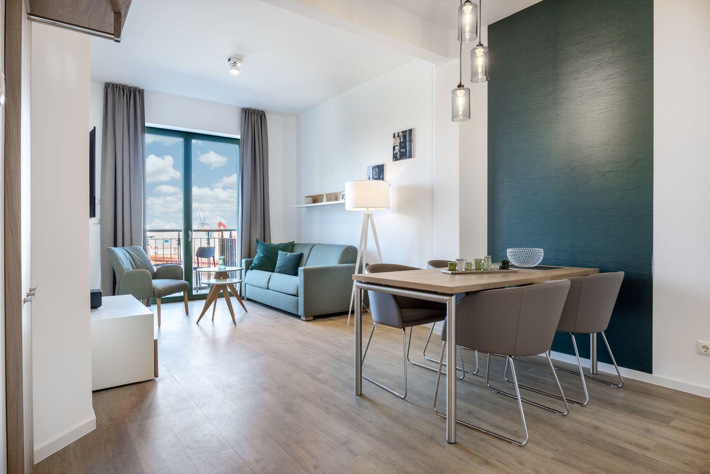 Das helle Apartment verfügt über bodentiefe Fenster, Fußbodenheizung, kostenfreies WLAN und eine voll ausgestattete offene Küche mit Geschirrspüler, Kühlschrank mit Tiefkühlfach, Herd mit 4 Glaskeramikkochfeldern und Backofen, Kaffeemaschine, Toaster, Wasserkocher und Mixstab. Im kombinierten Wohn-Essbereich befinden sich eine Doppelschlafcouch (1,40 x 2,00 m), ein Flatscreen-TV (42 Zoll), eine HiFi-Anlage sowie Gesellschaftsspiele. Genießt schöne Stunden auf dem Balkon mit direktem Blick zum Hafen. Das Schlafzimmer beinhaltet ein komfortables Boxspring-Doppelbett (1,80 x 2,00 m) und einen Flatscreen-TV (42 Zoll). Im geschmackvollen Badezimmer stehen euch eine ebenerdige Regendusche, ein Waschtisch, WC, ein Handtuchwärmer sowie ein Föhn zur Verfügung. Das Apartment verfügt über einen Safe für eine Laptopgröße bis ca. 17 Zoll.