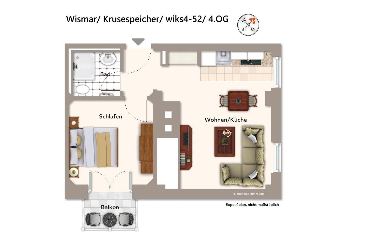 Das Nichtraucher-Apartment in Ost-Lage befindet sich im 4. Obergeschoss des denkmalgeschützten Krusespeichers. Der Alte Hafen von Wismar, einer der attraktivsten Orte der weltoffenen Hansestadt, liegt euch zu Füßen. Von hier aus lässt sich die Stadt und das wunderschöne Umland ideal erkunden. Der Alte Hafen ist übrigens überaus beliebter Veranstaltungsort für Events und Feste und überdies Original-Drehort für SOKO Wismar, die bekannte ZDF-Serie!