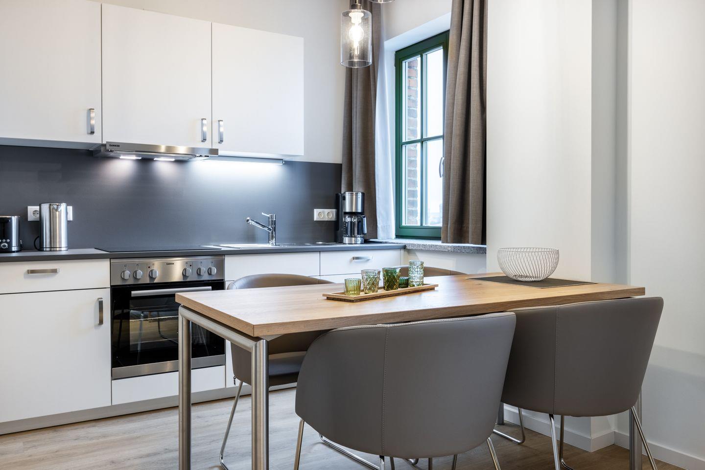 Das helle Apartment verfügt über bodentiefe Fenster im Schlafzimmer, Fußbodenheizung, kostenfreies WLAN und eine voll ausgestattete offene Küche mit Geschirrspüler, Kühlschrank mit Tiefkühlfach, Herd mit 4 Glaskeramikkochfeldern und Backofen, Kaffeemaschine, Toaster, Wasserkocher und Mixstab. Im kombinierten Wohn-Essbereich befinden sich eine Doppelschlafcouch (1,40 x 2,00 m), ein Flatscreen-TV (42 Zoll), eine HiFi-Anlage sowie Gesellschaftsspiele. Genießt schöne Stunden auf dem Balkon mit Blick zum Hafen. Das Schlafzimmer beinhaltet ein komfortables Boxspring-Doppelbett (1,80 x 2,00 m) und einen Flatscreen-TV (42 Zoll). Im geschmackvollen Badezimmer stehen euch eine ebenerdige Regendusche, ein Waschtisch, WC, ein Handtuchwärmer sowie ein Föhn zur Verfügung. Das Apartment verfügt über einen Safe für eine Laptopgröße bis ca. 17 Zoll. Haustiere sind in diesem Apartment herzlich willkommen.