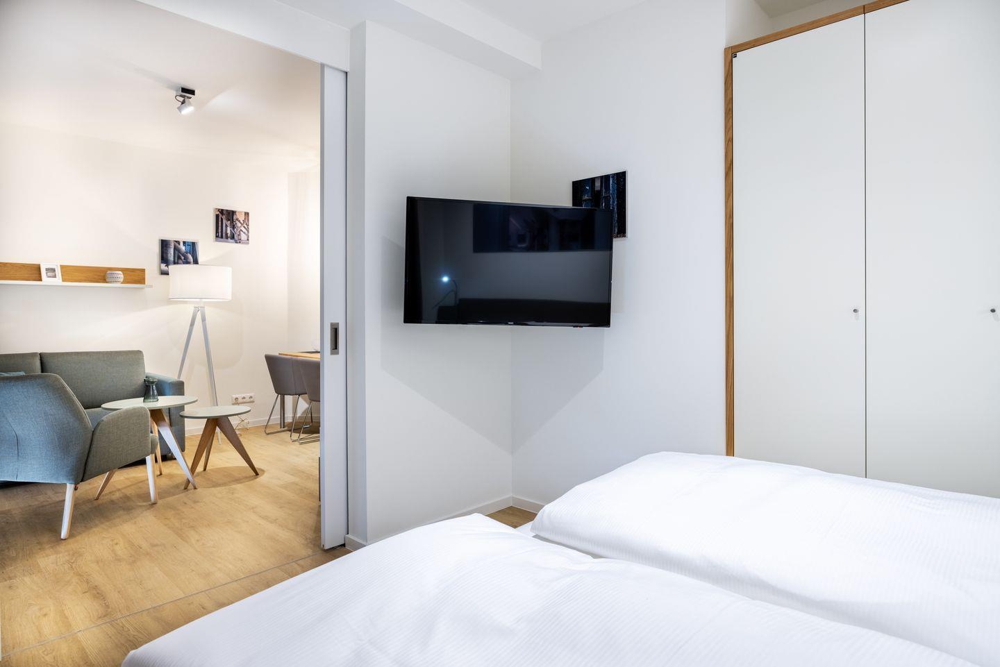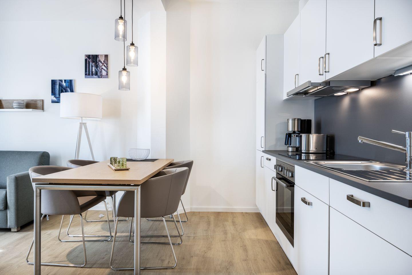 Das helle Apartment verfügt über bodentiefe Fenster, Fußbodenheizung, kostenfreies WLAN und eine voll ausgestattete offene Küche mit Geschirrspüler, Kühlschrank mit Tiefkühlfach, Herd mit 4 Glaskeramikkochfeldern und Backofen, Kaffeemaschine, Toaster, Wasserkocher und Mixstab. Im kombinierten Wohn-Essbereich befinden sich eine Einzelschlafcouch (1,20 x 2,00 m), ein Flatscreen-TV (42 Zoll), eine HiFi-Anlage sowie Gesellschaftsspiele. Auf dem Balkon genießt ihr den Blick auf den Hafen. Das Schlafzimmer beinhaltet ein komfortables Boxspring-Doppelbett (1,80 x 2,00 m) und einen Flatscreen-TV (42 Zoll). Im geschmackvollen Badezimmer stehen euch eine ebenerdige Regendusche, ein Waschtisch, WC, ein Handtuchwärmer sowie ein Föhn zur Verfügung. Das Apartment verfügt über einen Safe für eine Laptopgröße bis ca. 17 Zoll.