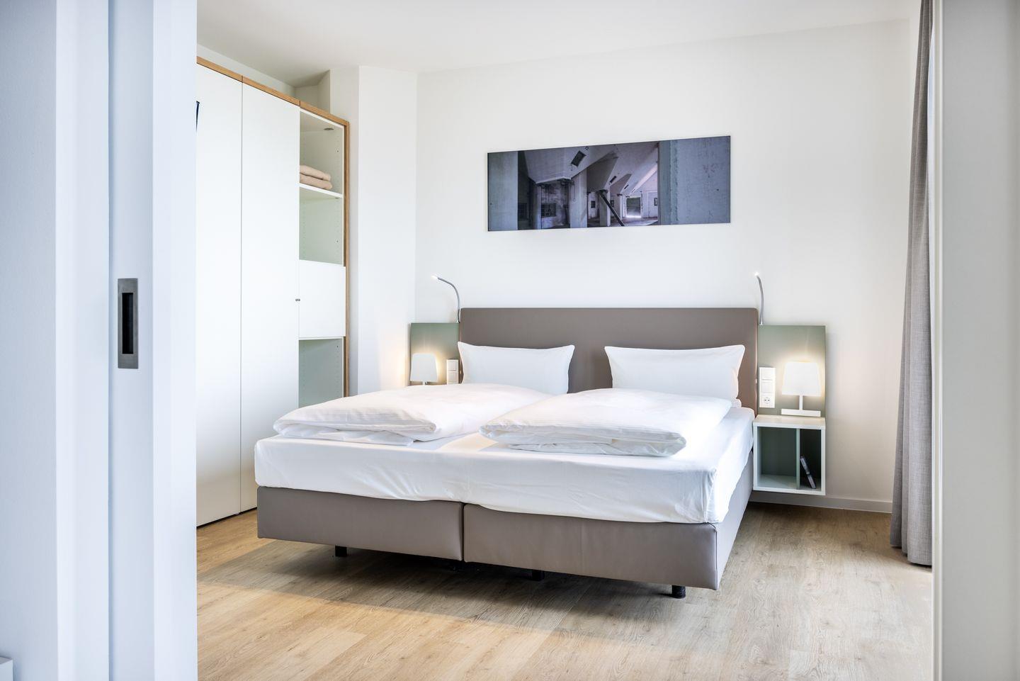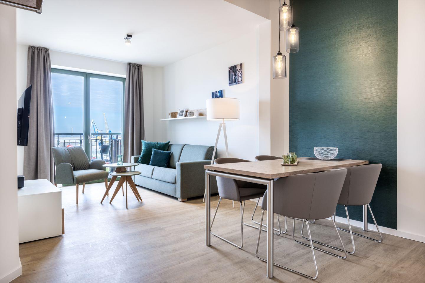Das helle Apartment verfügt über bodentiefe Fenster, Fußbodenheizung, kostenfreies WLAN und eine voll ausgestattete offene Küche mit Geschirrspüler, Kühlschrank mit Tiefkühlfach, Herd mit 4 Glaskeramikkochfeldern und Backofen, Kaffeemaschine, Toaster, Wasserkocher und Mixstab. Im kombinierten Wohn-Essbereich befinden sich eine Doppelschlafcouch (1,40 x 2,00 m), ein Flatscreen-TV (42 Zoll), eine HiFi-Anlage sowie Gesellschaftsspiele. Genießt schöne Stunden auf dem Balkon mit direktem Blick zum Hafen. Das Schlafzimmer beinhaltet ein komfortables Boxspring-Doppelbett (1,80 x 2,00 m) und einen Flatscreen-TV (42 Zoll). Im geschmackvollen Badezimmer stehen euch eine ebenerdige Regendusche, ein Waschtisch, WC, ein Handtuchwärmer sowie ein Föhn zur Verfügung. Das Apartment verfügt über einen Safe für eine Laptopgröße bis ca. 17 Zoll.