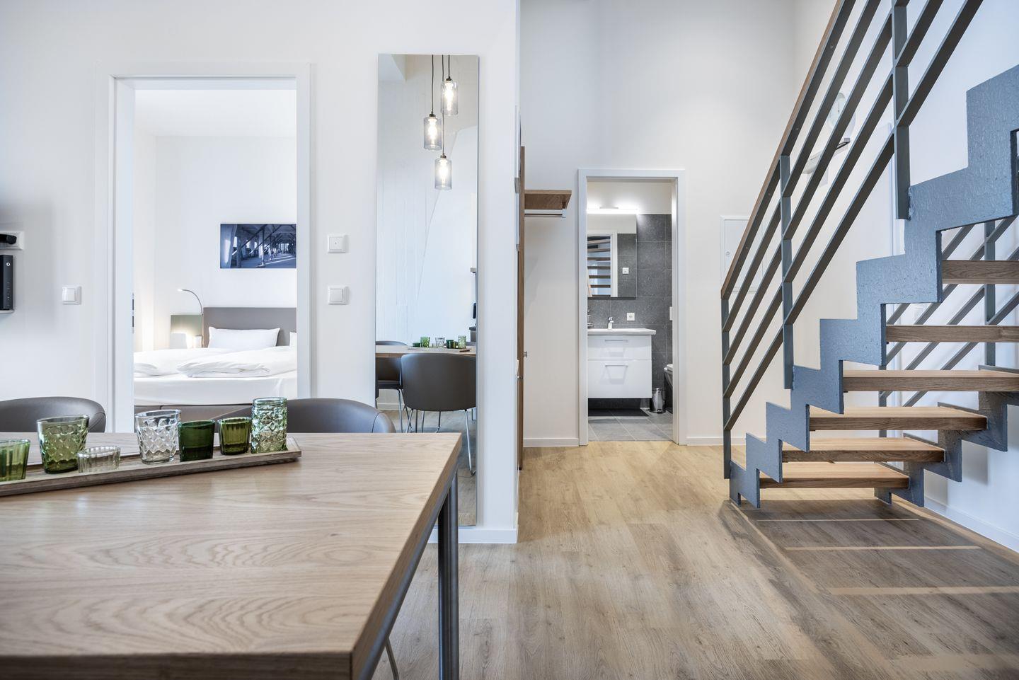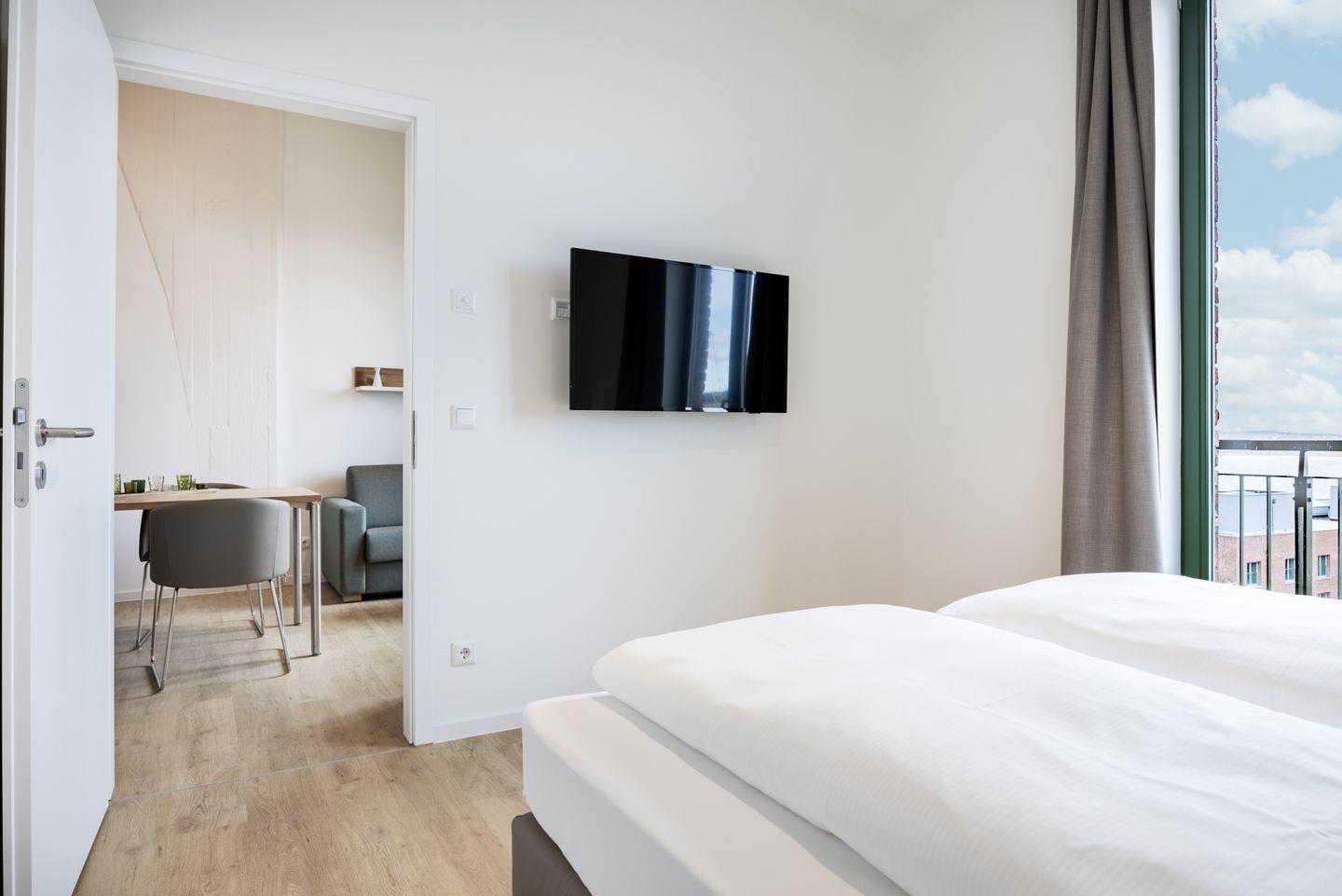 Das helle Apartment verfügt über bodentiefe Fenster, Fußbodenheizung, kostenfreies WLAN und einen Safe für eine Laptopgröße bis ca. 17 Zoll.