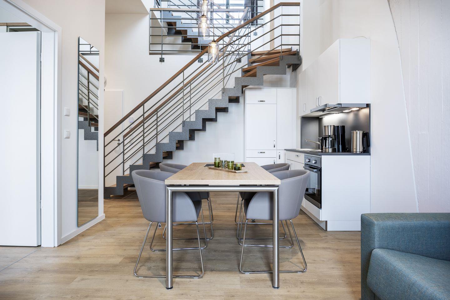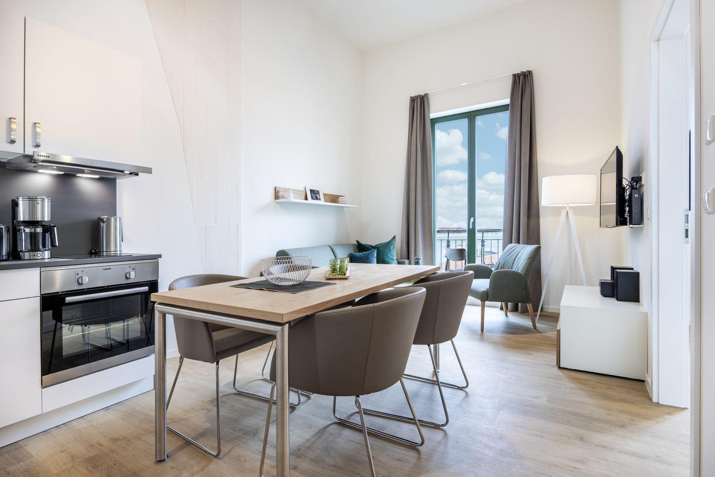 Auf der ersten Wohnebene befindet sich die voll ausgestattete offene Küche mit Geschirrspüler, Kühlschrank mit Tiefkühlfach, Herd mit 2 Glaskeramikkochfeldern und Backofen, Kaffeemaschine, Toaster, Wasserkocher und Mixstab sowie der kombinierte Wohn-Essbereich mit Flatscreen-TV (42 Zoll), HiFi-Anlage und Gesellschaftsspielen. Hier befindet sich auch das geschmackvolle Badezimmer mit ebenerdiger Regendusche, Waschtisch, WC, Handtuchwärmer und Föhn. Das Schlafzimmer auf dieser Ebene verfügt über ein komfortables Boxspring-Doppelbett (1,80 x 2,00 m) und einen Flatscreen-TV (42 Zoll). Sowohl vom Schlafzimmer als auch vom Wohnbereich aus habt ihr Zugang zum sonnigen Balkon in West-Lage. Hier genießt ihr einen wundervollen Ausblick auf die maritime Hafenkulisse.