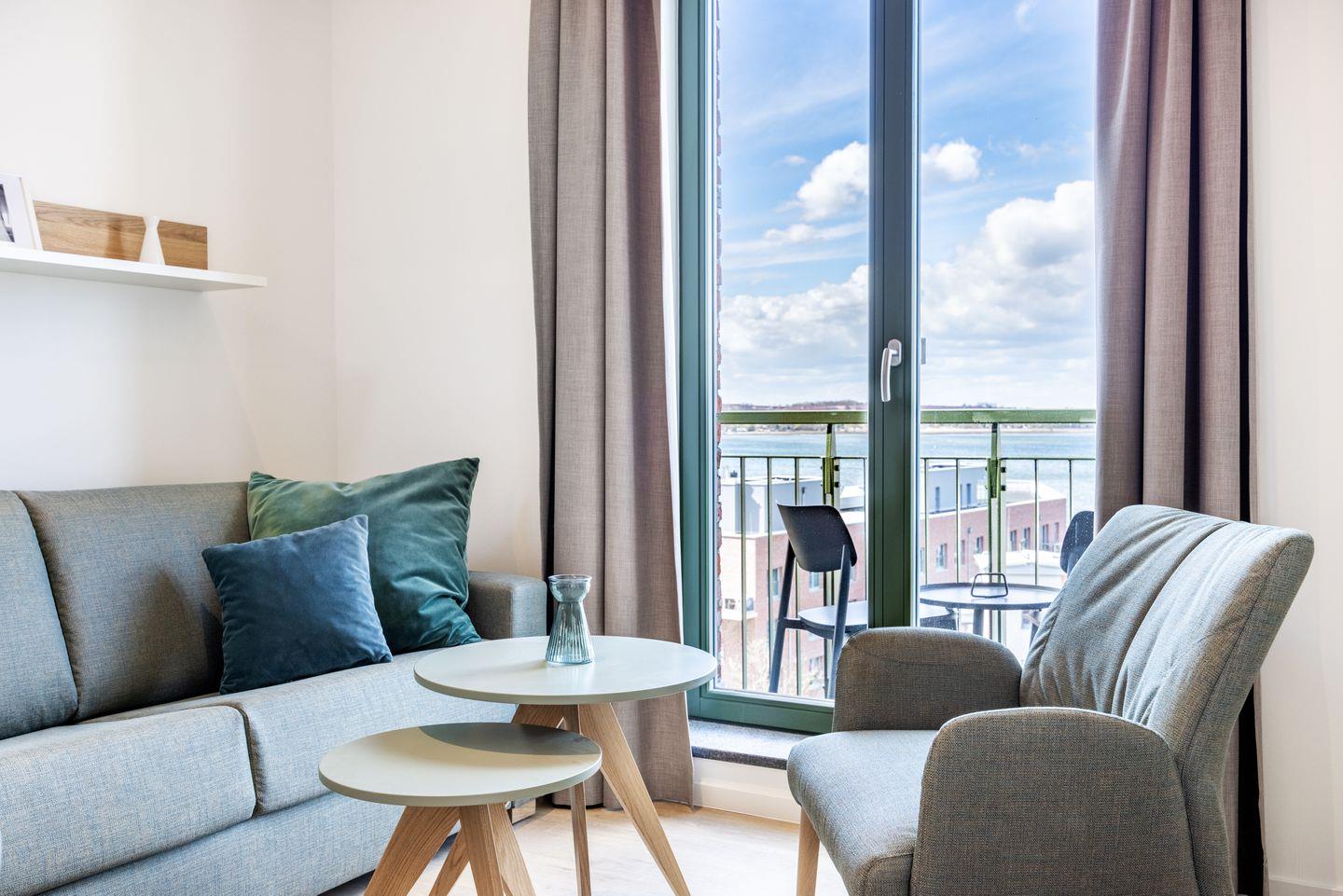 Das helle Apartment verfügt über bodentiefe Fenster, Fußbodenheizung, kostenfreies WLAN und einen Safe für eine Laptopgröße bis ca. 17 Zoll.