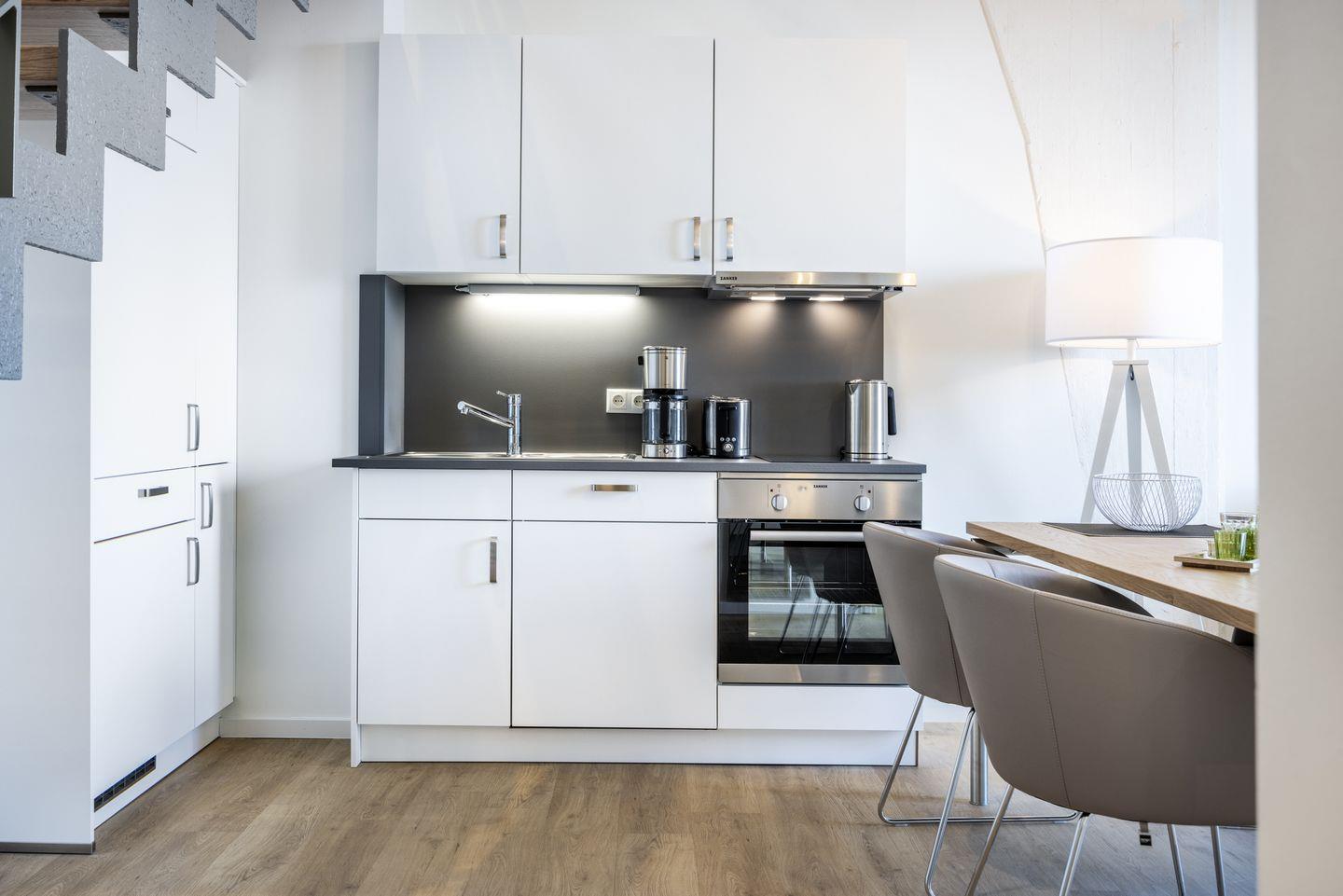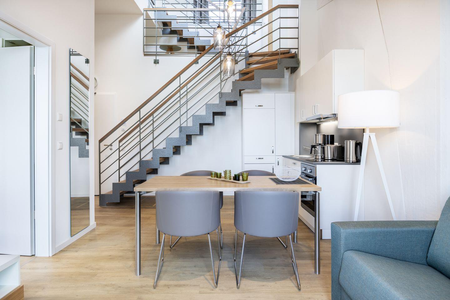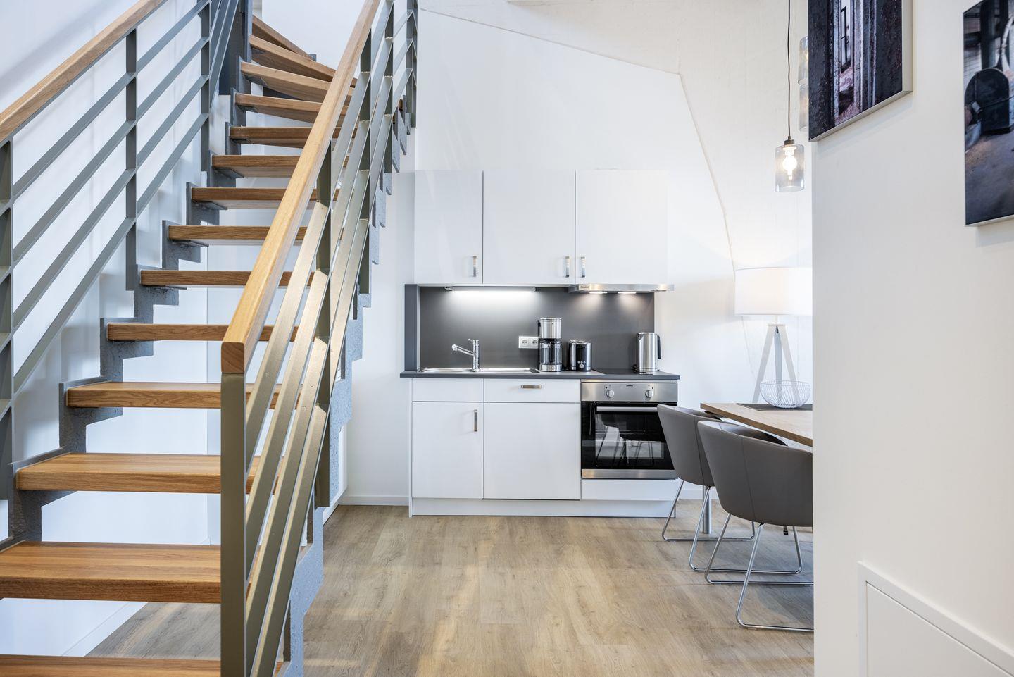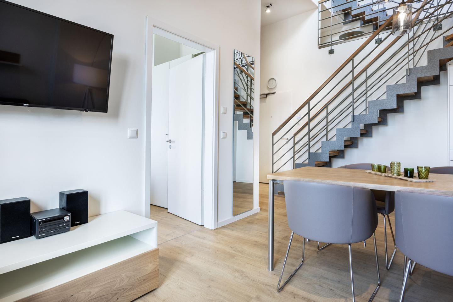 Auf der ersten Wohnebene befindet sich die voll ausgestattete offene Küche mit Geschirrspüler, Kühlschrank mit Tiefkühlfach, Herd mit 2 Glaskeramikkochfeldern und Backofen, Kaffeemaschine, Toaster, Wasserkocher und Mixstab sowie der kombinierte Wohn-Essbereich mit Flatscreen-TV (42 Zoll), HiFi-Anlage und Gesellschaftsspielen. Hier befindet sich auch das geschmackvolle Badezimmer mit ebenerdiger Regendusche, Waschtisch, WC, Handtuchwärmer und Föhn. Das Schlafzimmer auf dieser Ebene verfügt über ein komfortables Boxspring-Doppelbett (1,80 x 2,00 m) und einen Flatscreen-TV (42 Zoll). Sowohl vom Schlafzimmer als auch vom Wohnbereich aus habt ihr Zugang zum sonnigen Balkon in West-Lage. Hier genießt ihr einen wundervollen Ausblick auf die maritime Hafenkulisse.