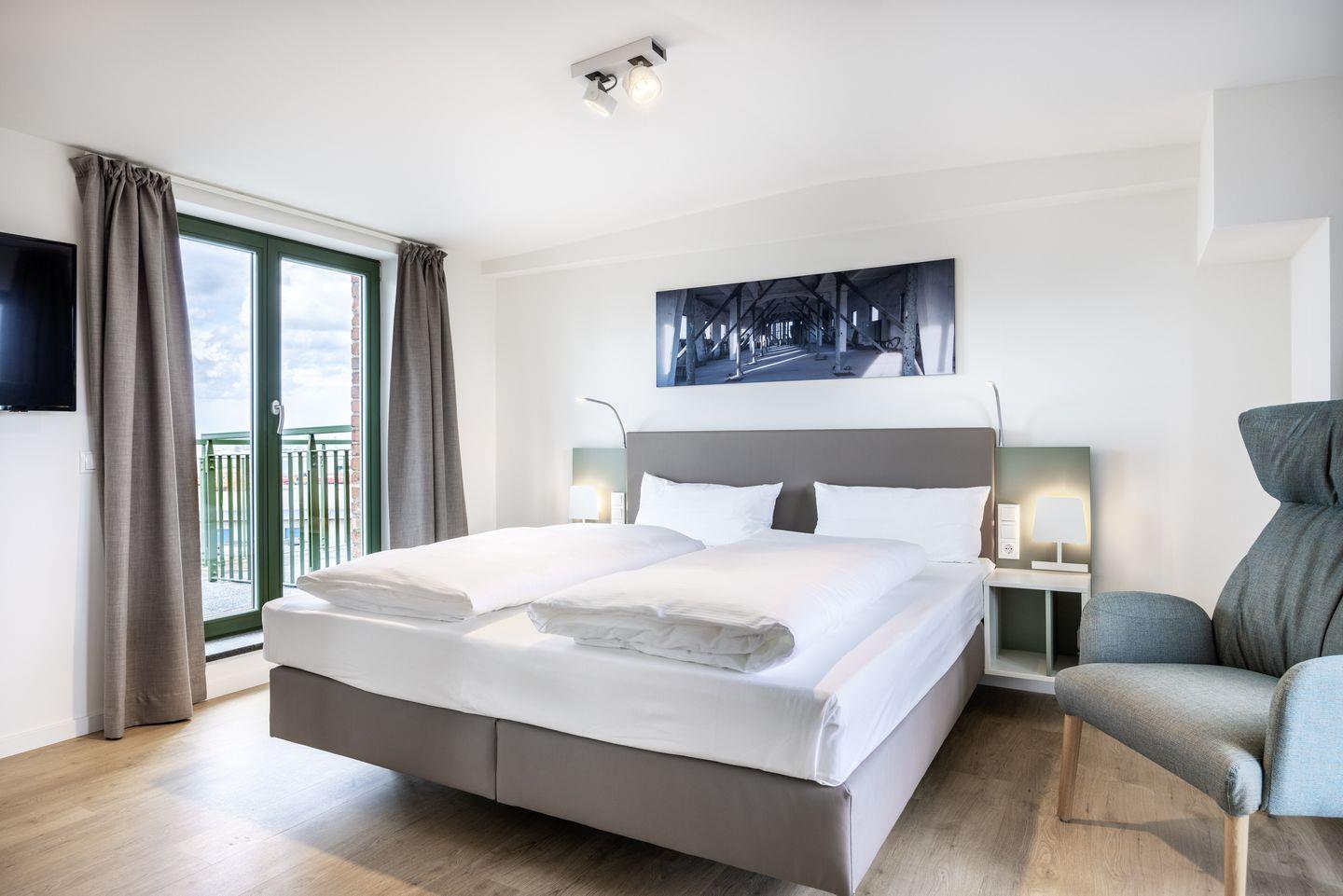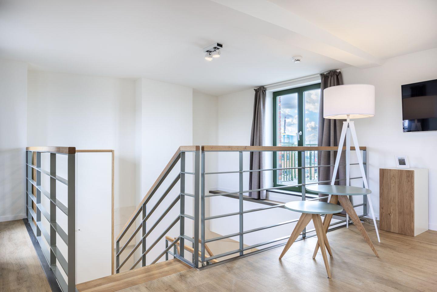 Auf der zweiten Wohnebene des Maisonette-Apartments befindet sich das Galerieschlafzimmer und die nach Westen gelegene Dachterrasse mit beeindruckendem Blick über den Hafen. Der Schlafbereich verfügt über ein komfortables Boxspring-Doppelbett (1,80 x 2,00 m) und einen Flatscreen-TV (42 Zoll). Haustiere sind in diesem Apartment nicht zugelassen. Ein Kinderbett kann gegen Entgelt im Schlafzimmer aufgestellt werden .