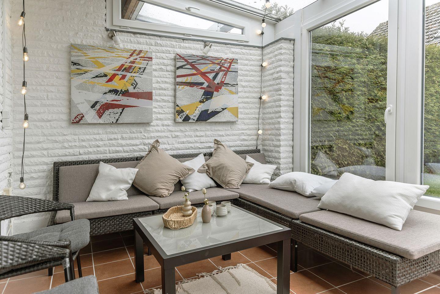 Wohnzimmer mit Alexa/Bluetooth-Box, Ausgang zu Wintergarten, Terrasse und Garten. Hier befindet sich zusätzlich ein Doppelbett (160 × 200) hinter einem Raumtrenner.