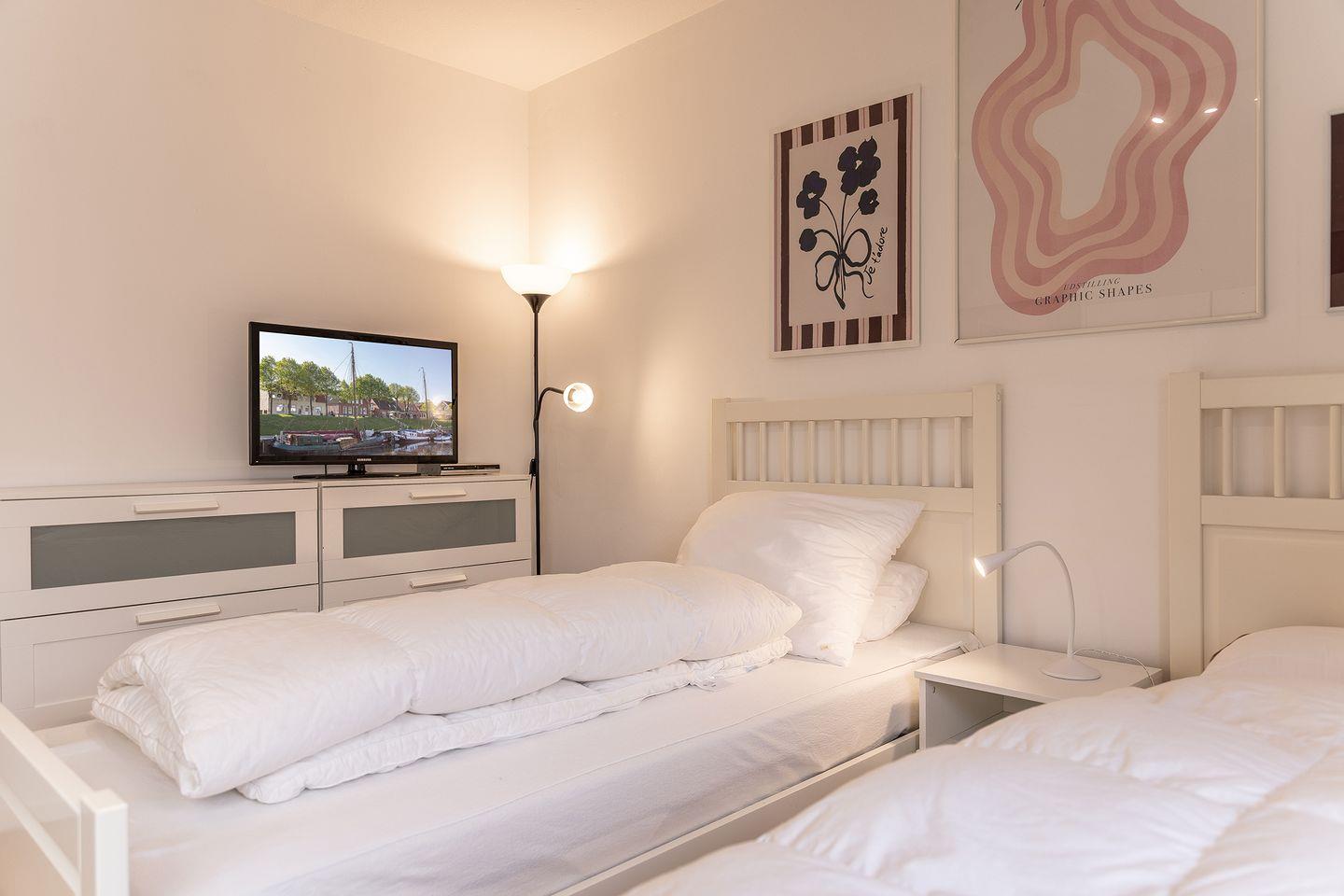 Schlafzimmer mit zwei Einzelbetten (nebeneinander). Optional Rausfallschutz für Kleinkinder für eines der Einzelbetten vorhanden, ebenso Kinderreisebett mit Wickelunterlage.