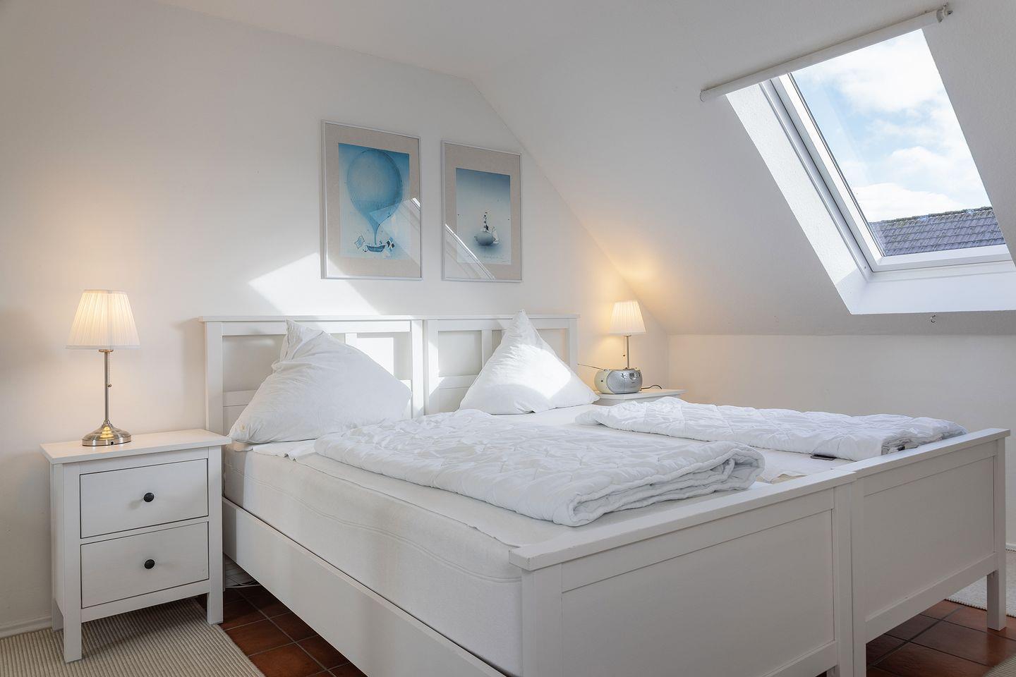 Schlafzimmer mit zwei Einzelbetten (nebeneinander) und zustellbarem Kinderreisebett
