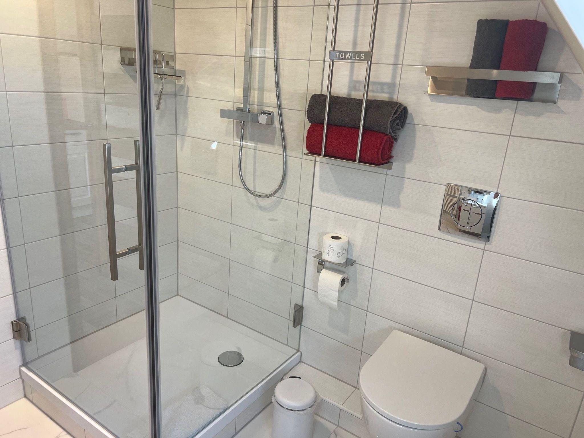 Das moderne Bad verfügt über eine große Dusche, Föhn und ausreichend Handtücher für Ihren