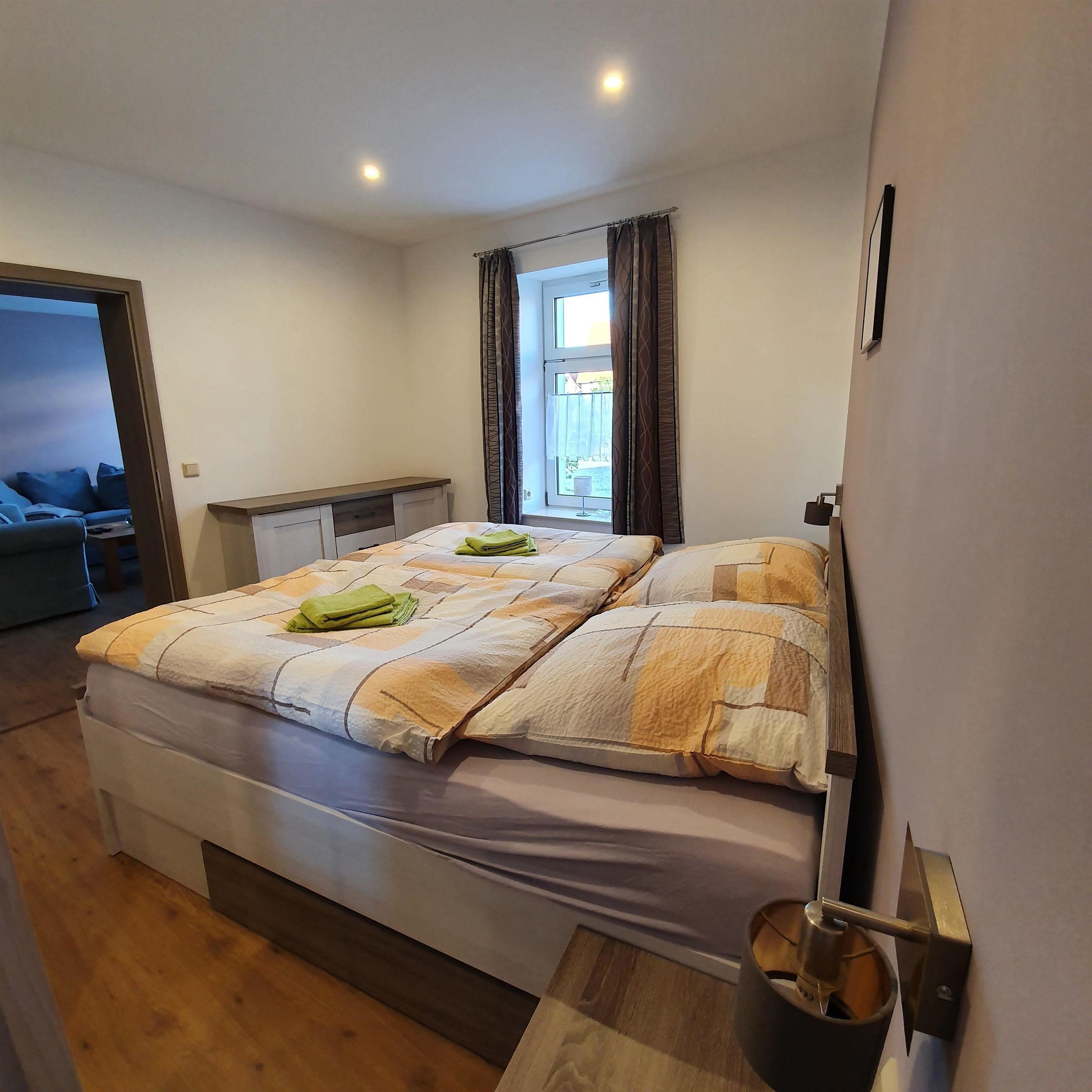 Im zweiten Schlafzimmer befindet sich ein Doppelbett, Kleiderschrank und Kommode.