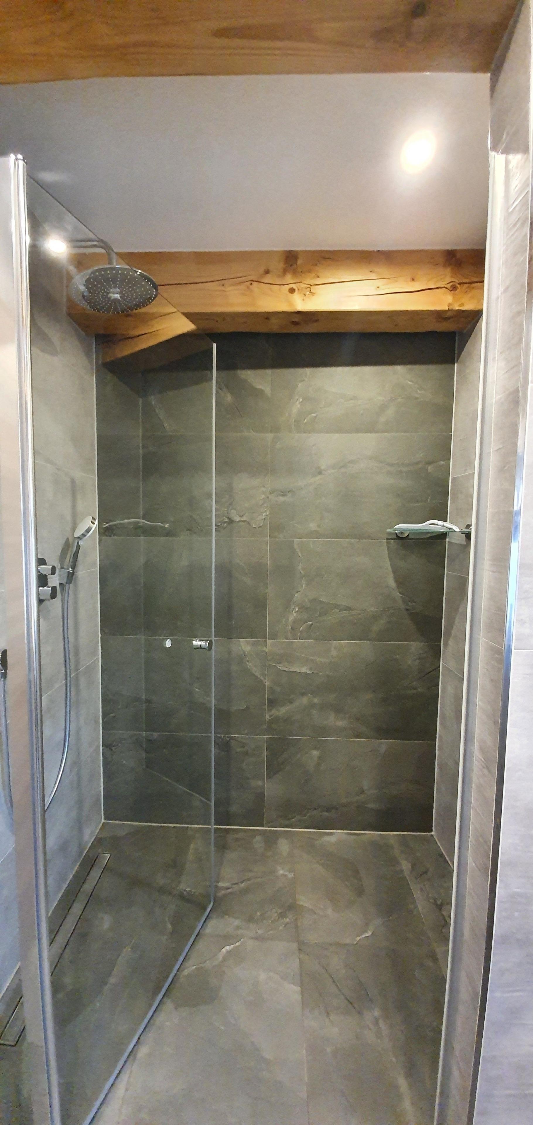 Im modern eingerichteten Bad finden sie eine große ebenerdige Dusche mit Regenschauer, Toilette und Waschbecken.