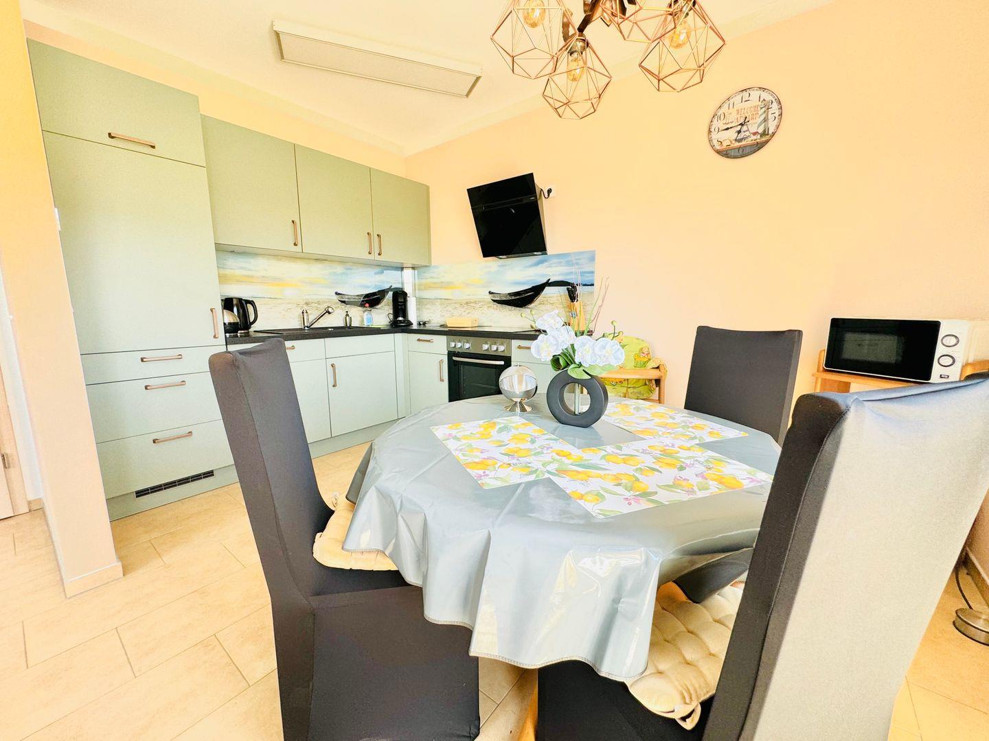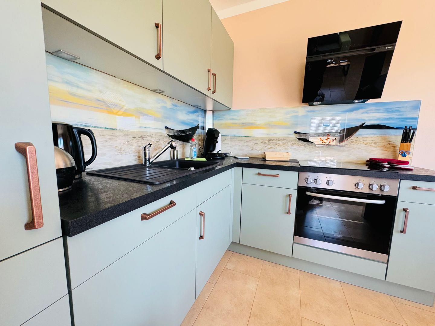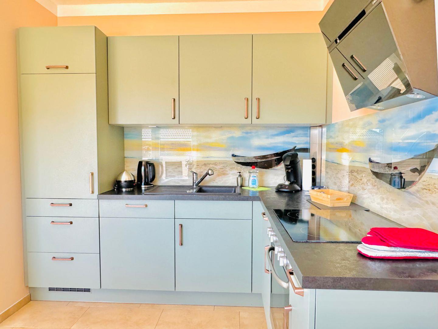 Der kombinierte Wohn- und Essbereich mit offener Küche bietet alles, was Sie für einen entspannten Aufenthalt benötigen: Mikrowelle, Cerankochfeld, Backofen, Spülmaschine und vieles mehr. Darüberhinaus verfügt die Wohnung über eine separate Kühltruhe - an die Angler: das Putzen und ausnehmen von Fischen ist in der Wohnung nicht gestattet.