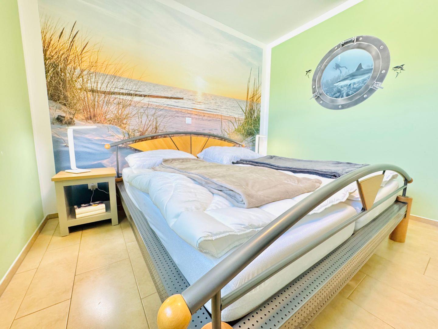 Das Schlafzimmer verfügt über ein gemütliches Doppelbett mit getrennten Matratzen, einen Kleiderschrank und einen TV. Im Wohnzimmer gibt es zudem eine Schlafmöglichkeit auf dem Sofa. Das Badezimmer ist mit einer ebenerdigen Dusche, WC, Föhn und Waschbecken ausgestattet.