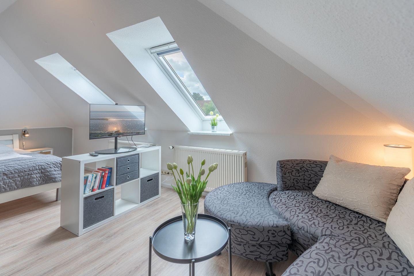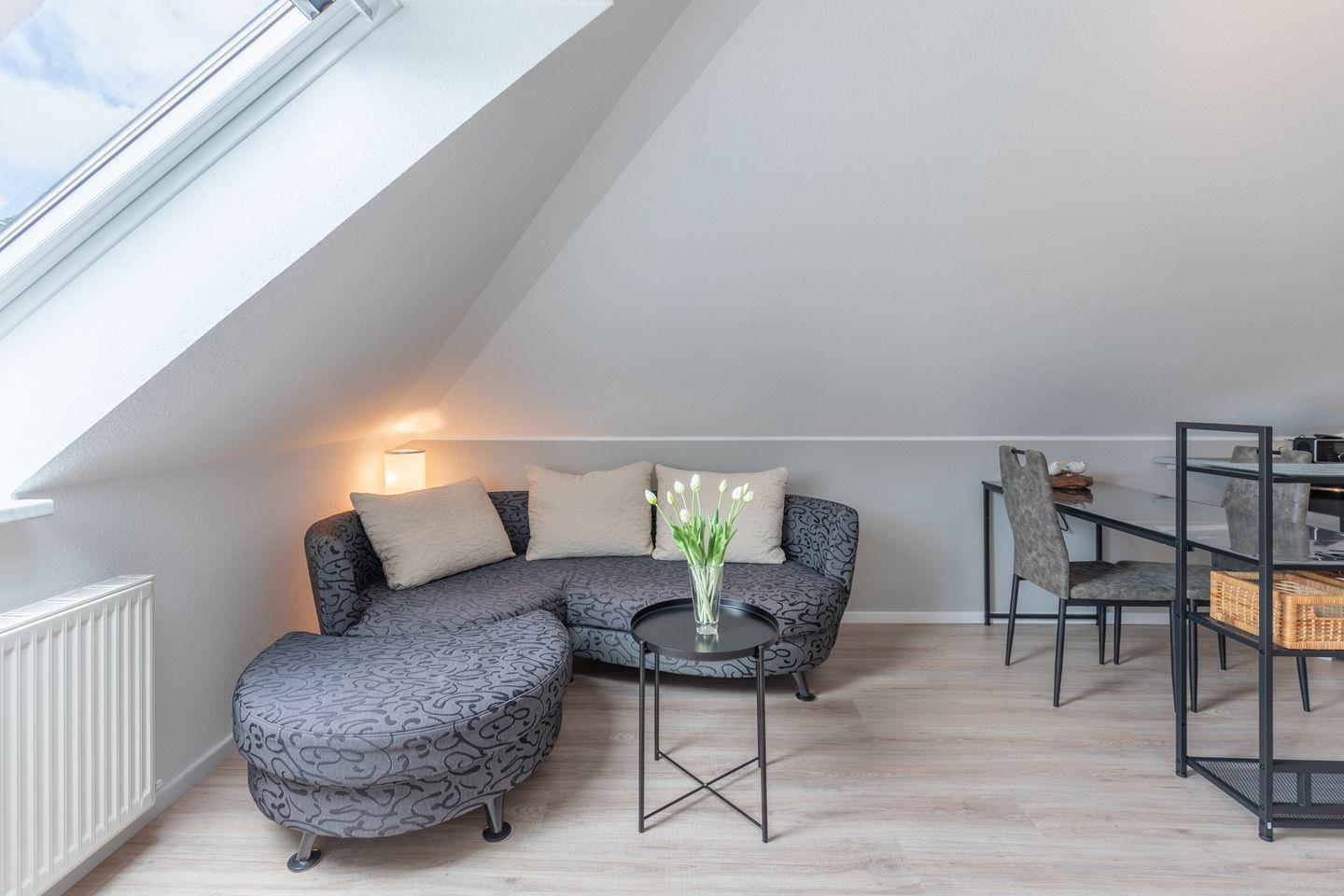 Im großzügigen Wohnraum finden Sie eine gemütliche Sofaecke sowie einen Esstisch. Modernes technisches Equipment wie ein Flachbild-TV, Radio und ein Internetanschluss mit einer Geschwindigkeit ab 500 Mbit/s (Kabel/Glasfaser) sorgen für Unterhaltung und beste Vernetzung. Bücher und Spiele ergänzen das Angebot für entspannte Stunden in der Unterkunft.