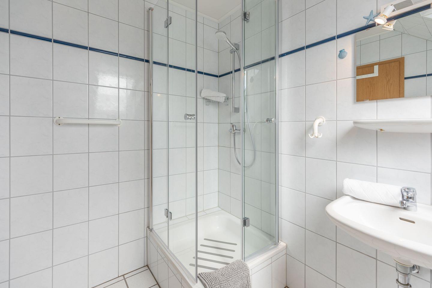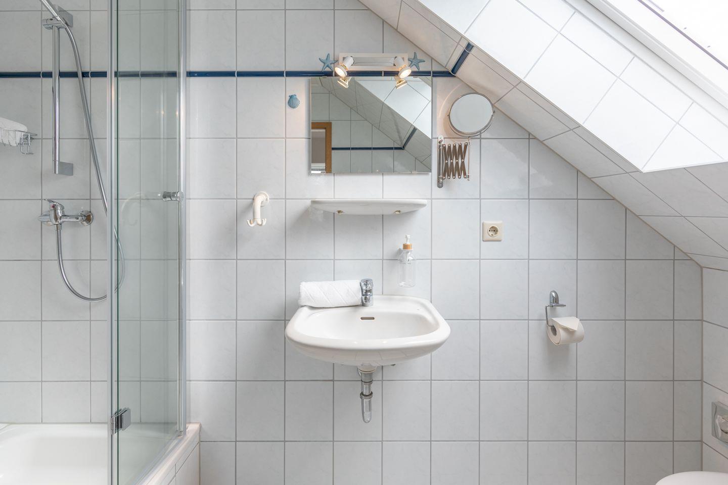Im Badezimmer finden Sie eine komfortable Dusche, ein Waschbecken, ein WC, einen Spiegel, einen Kosmetikspiegel und einen Haartrockner.